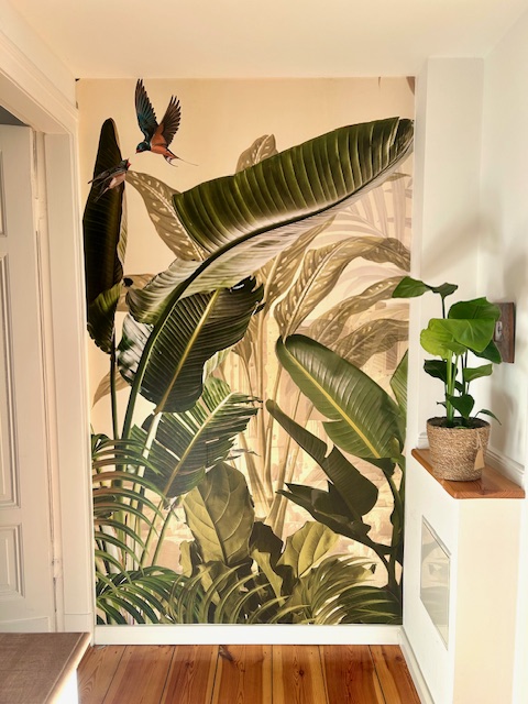 Sie können die Tapete sehr vorsichtig mit einem leicht feuchten Schwamm reinigen. Wir raten jedoch davon ab, die Tapete zu schrubben oder Reinigungsmittel zu verwenden, da dies die Oberfläche und die Farben der Tapete beschädigen kann.