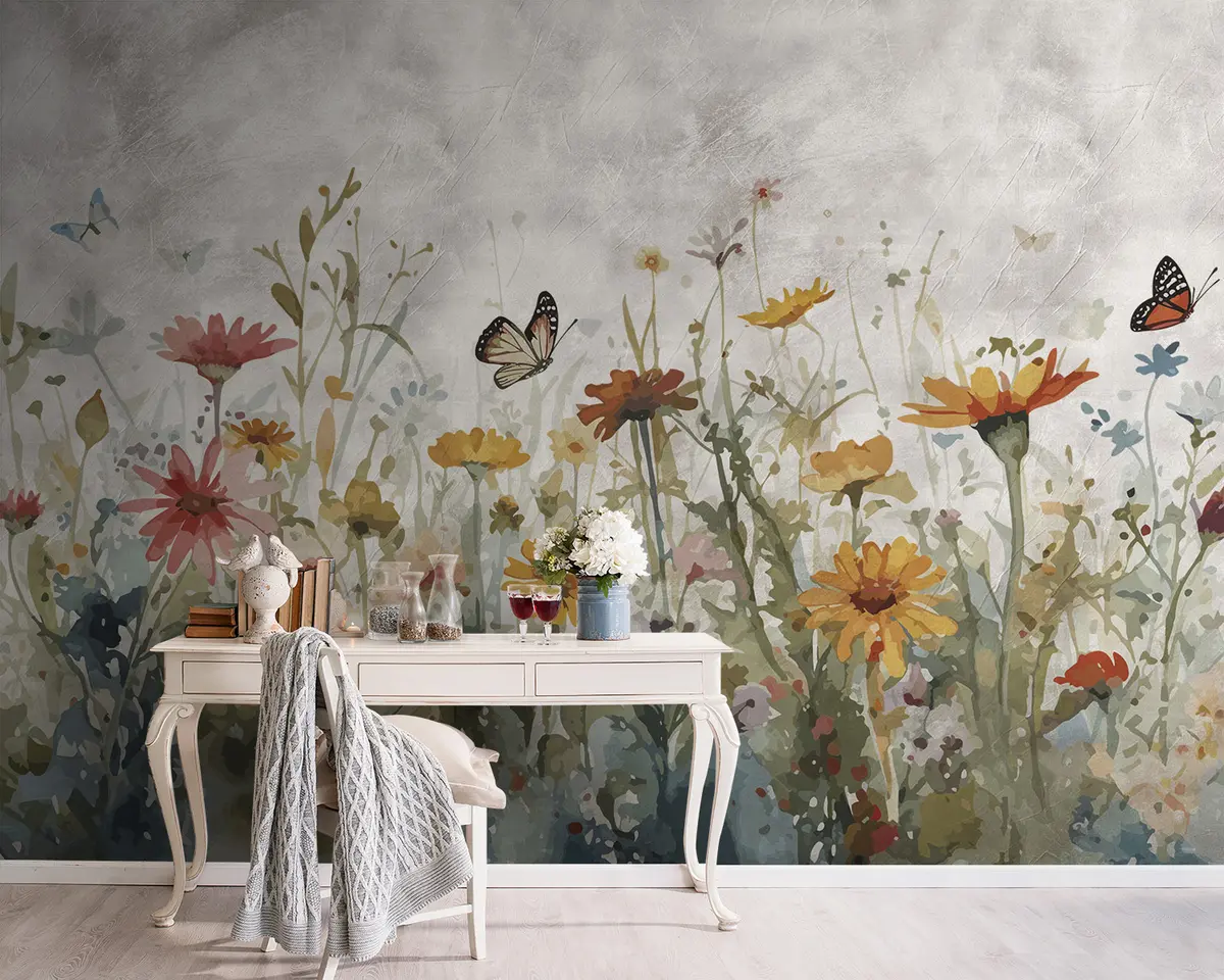 Fototapeten Aquarell-Wildblumen und Schmetterlinge Nr. u95406