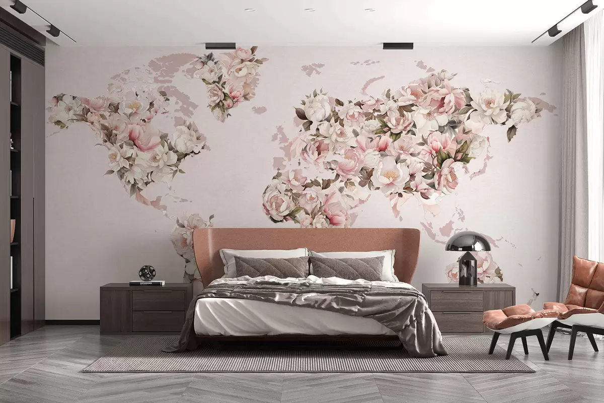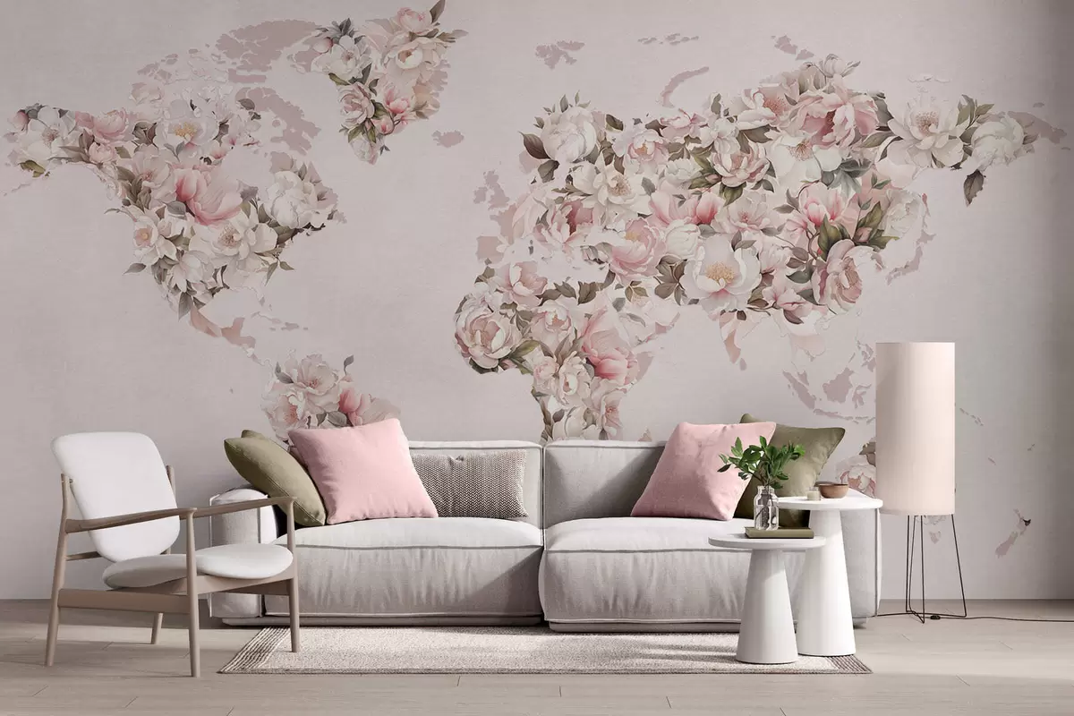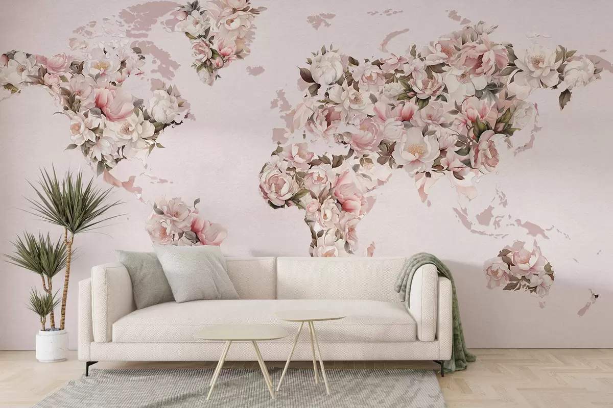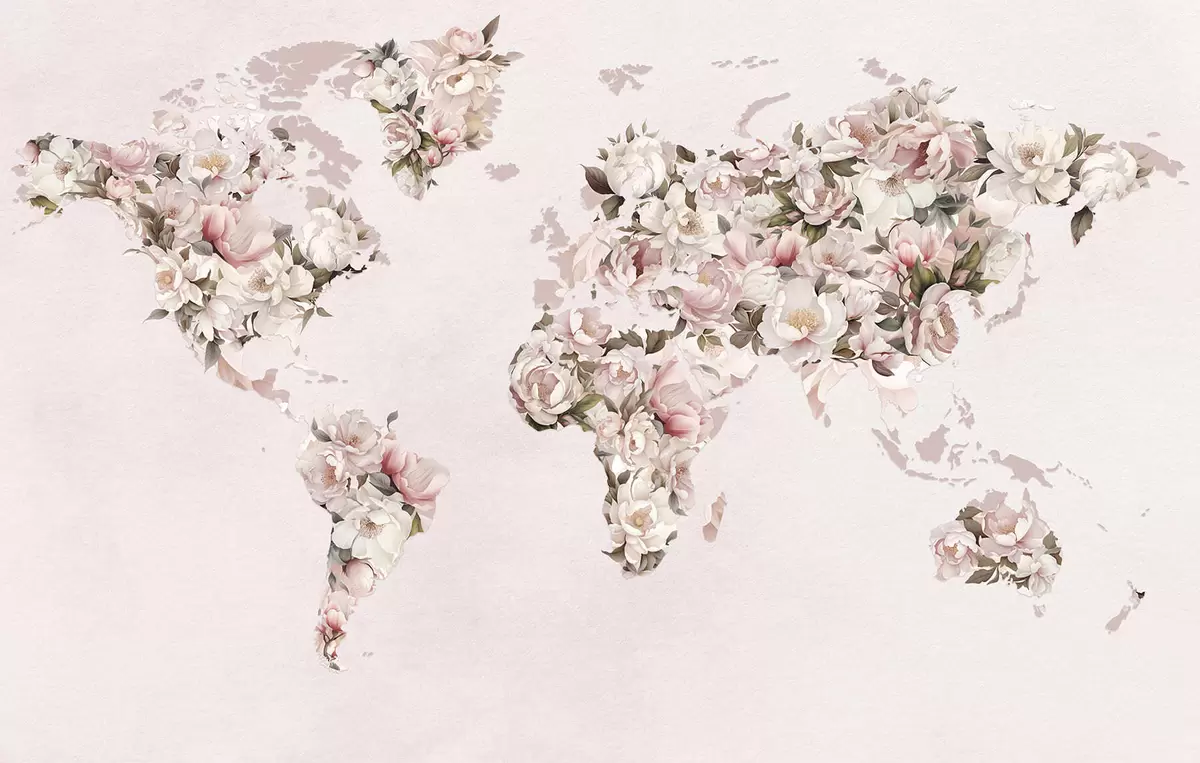 Fototapeten Eine rosa Weltkarte aus großen weißen und rosa Pfingstrosen Nr. c00005