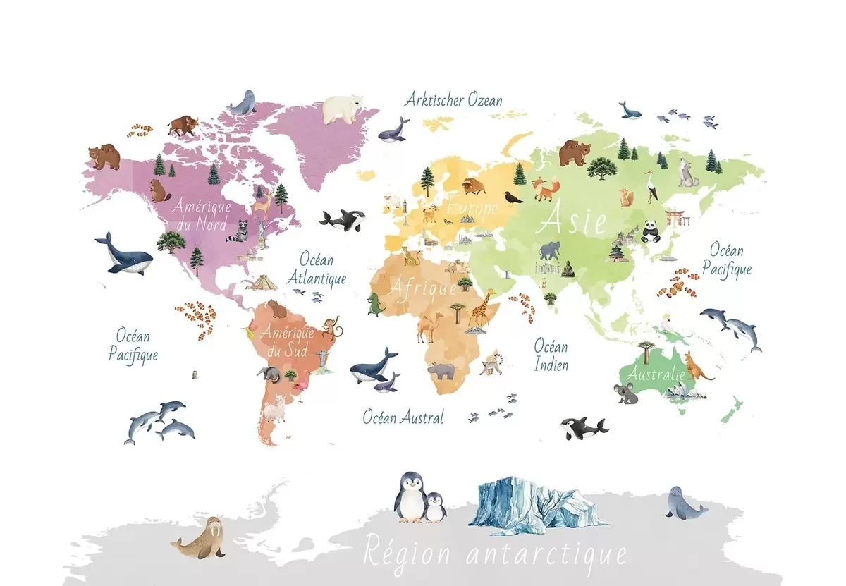 Fototapeten Eine Farbkarte im Aquarellstil mit Tieren, Pflanzen und architektonischen Motiven. Beschriftungen auf Französisch Nr. c00009fr