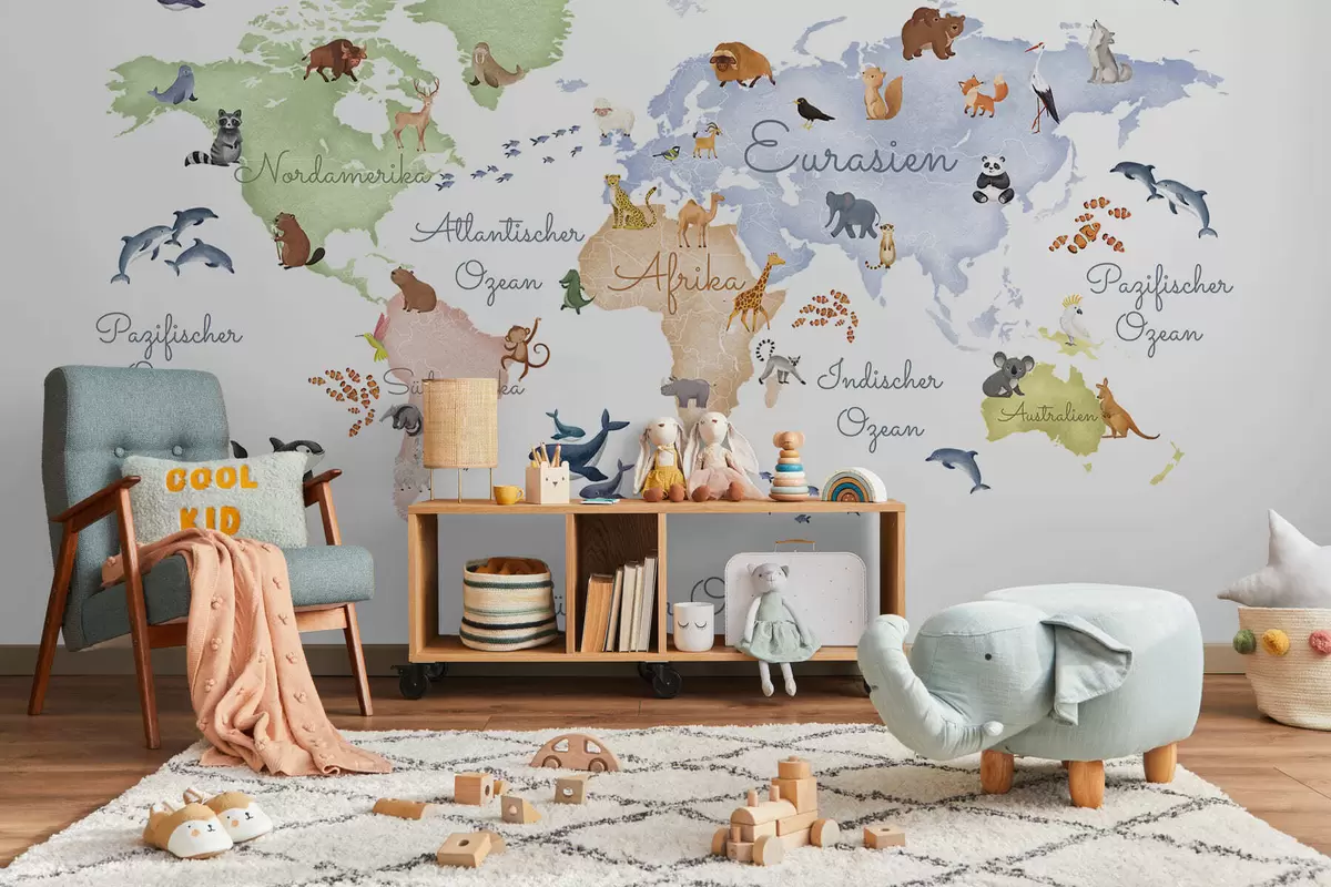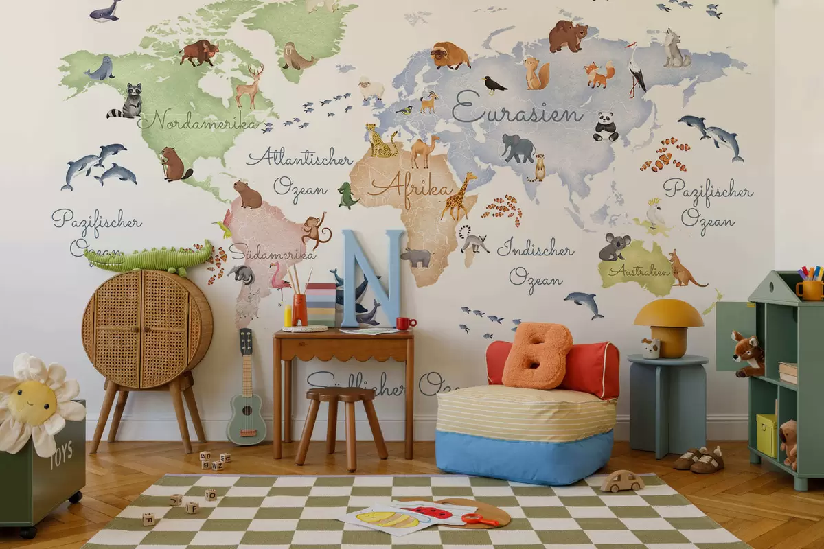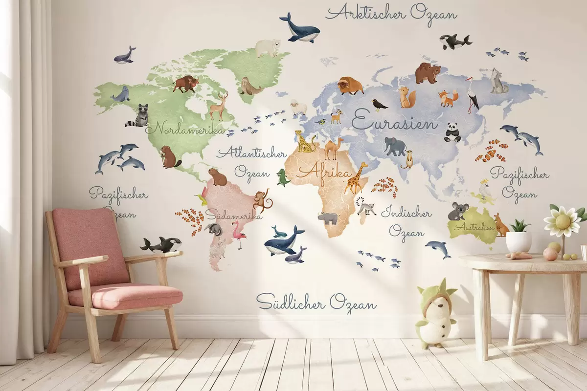 Fototapeten Eine Karte im Aquarellstil mit Tieren. Beschriftungen auf Deutsch Nr. c00012de