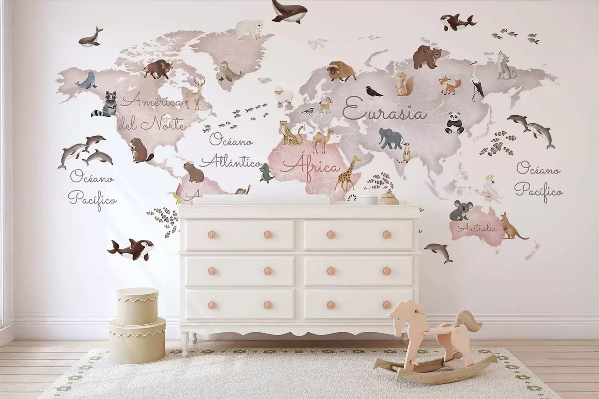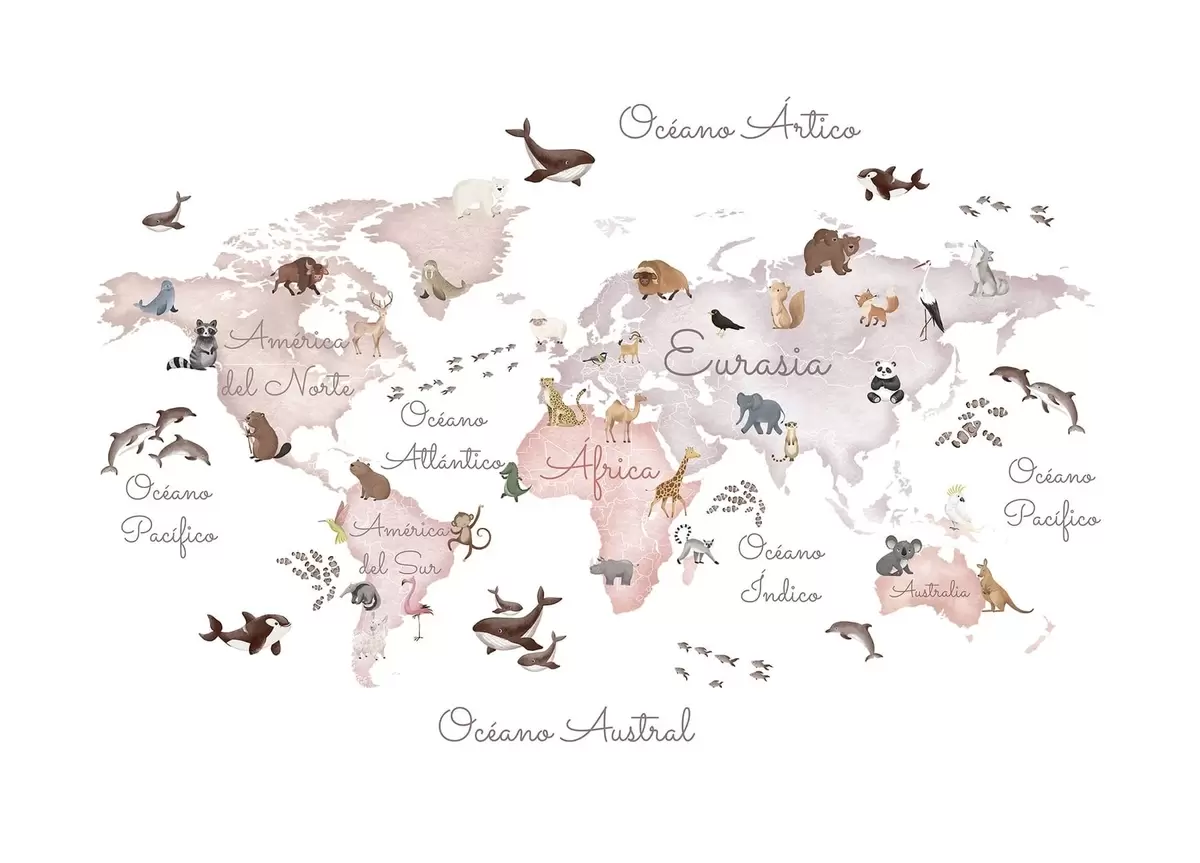 Fototapeten Eine beigefarbene Karte im Aquarellstil mit Tiermotiven. Beschriftungen auf Spanisch Nr. c00012esv3