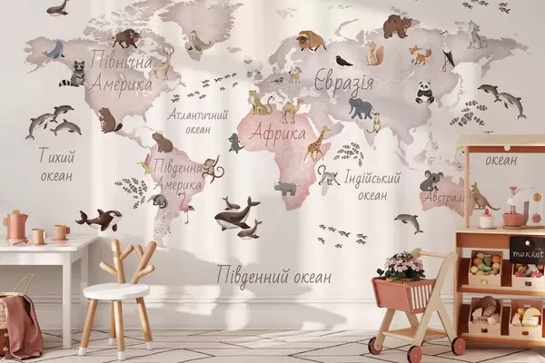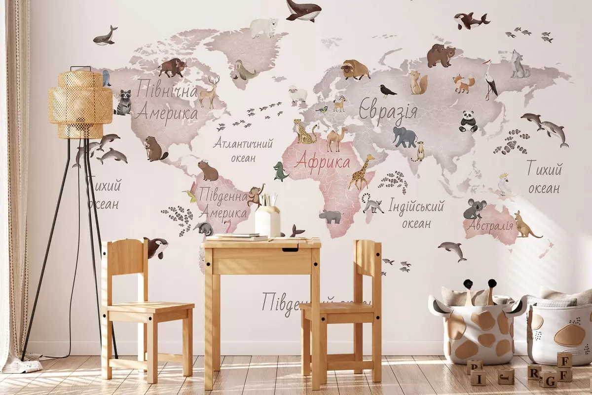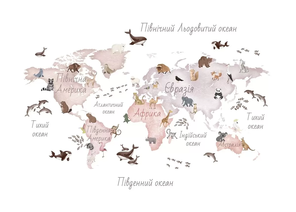 Fototapeten Eine beigefarbene Karte im Aquarellstil mit Tiermotiven. Beschriftungen auf Ukrainisch Nr. c00012ukv3