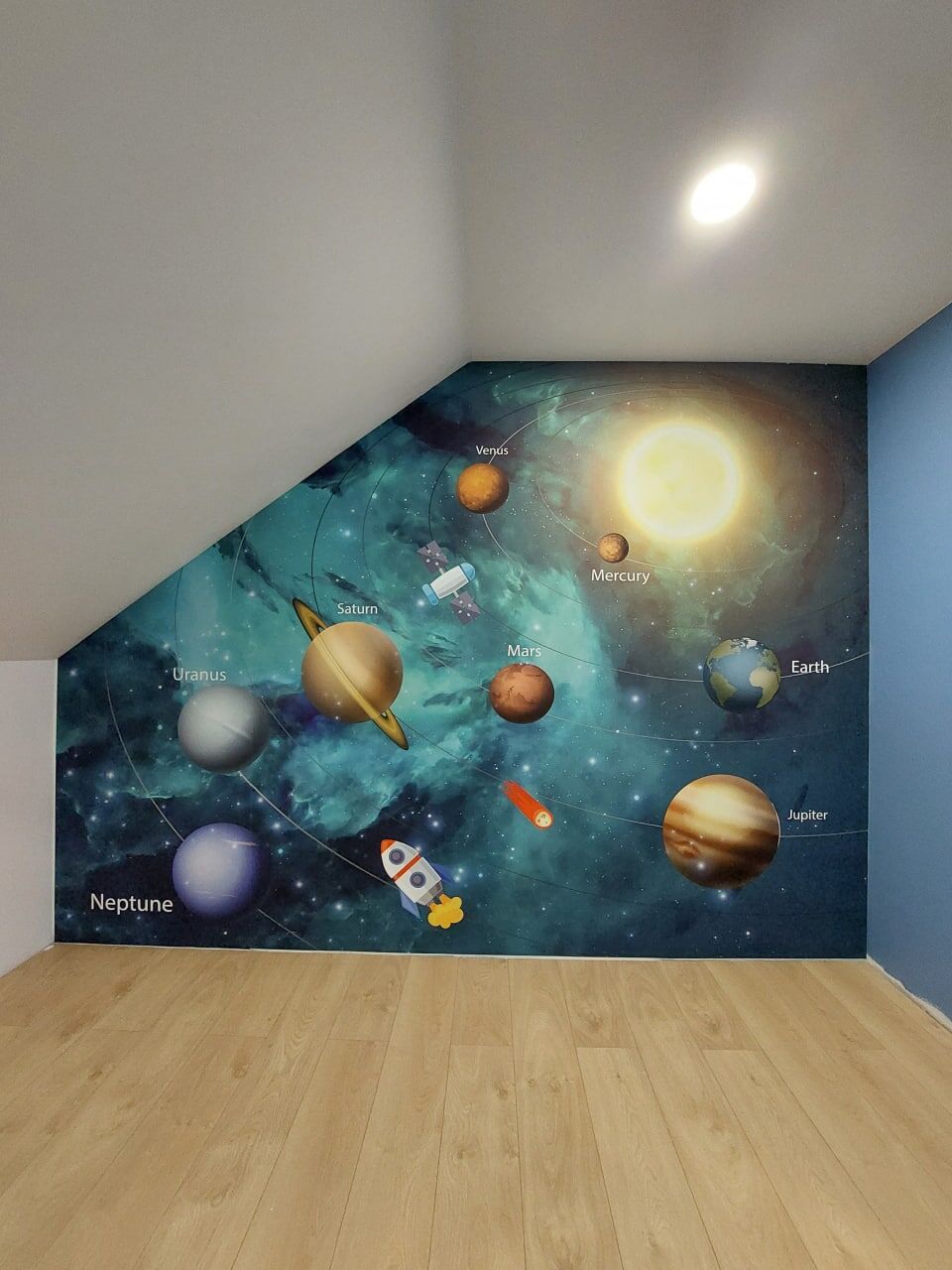 Fototapeten Eine farbenfrohe Illustration, die verschiedene Planeten und Weltraum-Aquarelle darstellt Nr. w00539