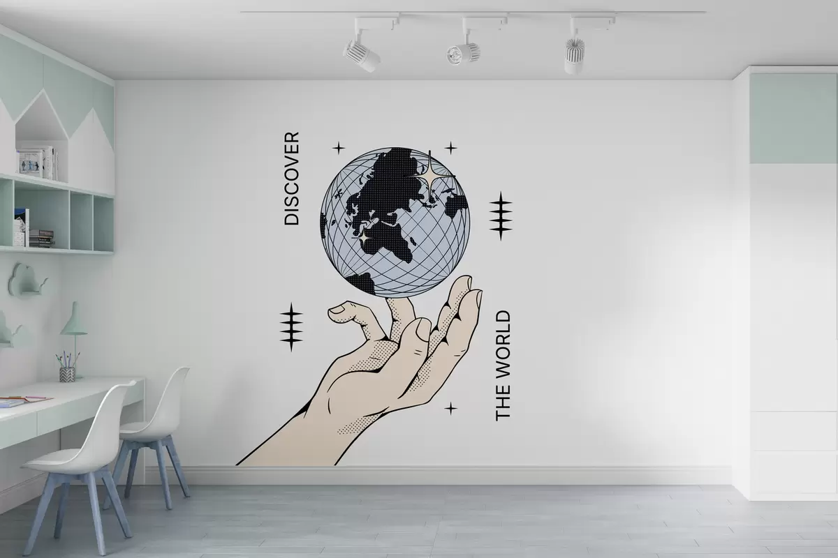 Fototapeten Beige Hand dreht den Globus auf weißem Hintergrund für die Raum- oder Bürodekoration Nr. w00984