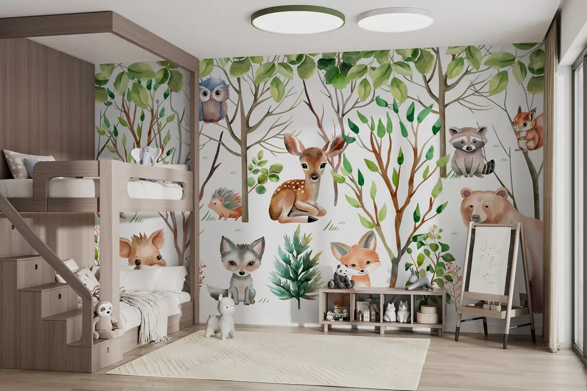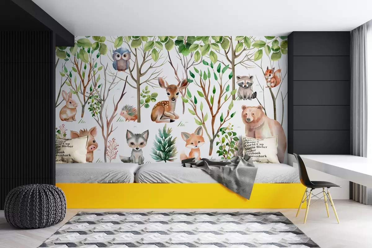 Fototapeten Kindertapete Tiere des Waldes. Farbige Tapete auf einem weißen Hintergrund Nr. w01127