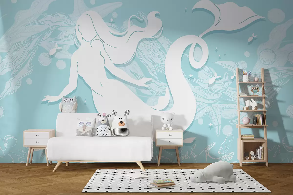 Fototapeten Eine weiße Meerjungfrau mit langen wallenden Haaren schwimmt in einem hellblauen Ozean mit weißen Wellen und Blasen Nr. w01316