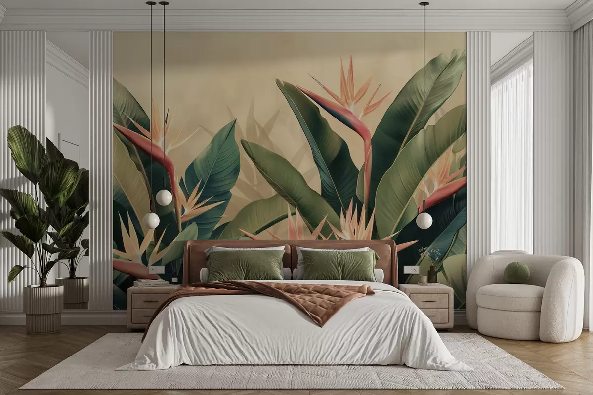 Fototapeten Üppiges Arrangement aus tropischen Blumen, umgeben von großen dunkelgrünen Blättern Nr. w01484v1