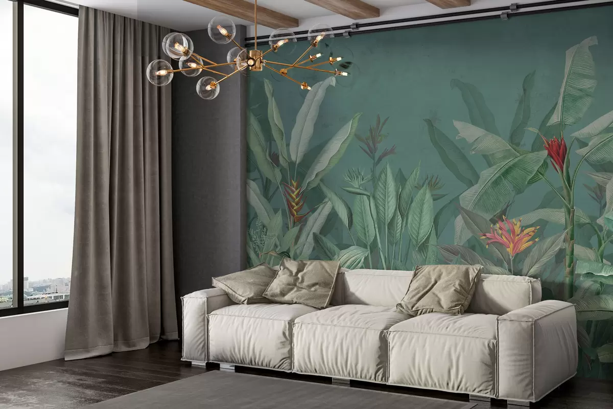 Fototapeten Tropische Blätter und Blumen auf einem grünen Hintergrund Nr. w01834v2