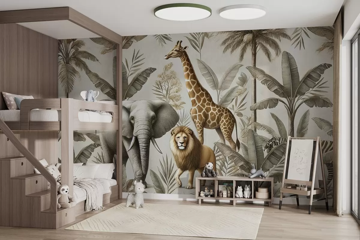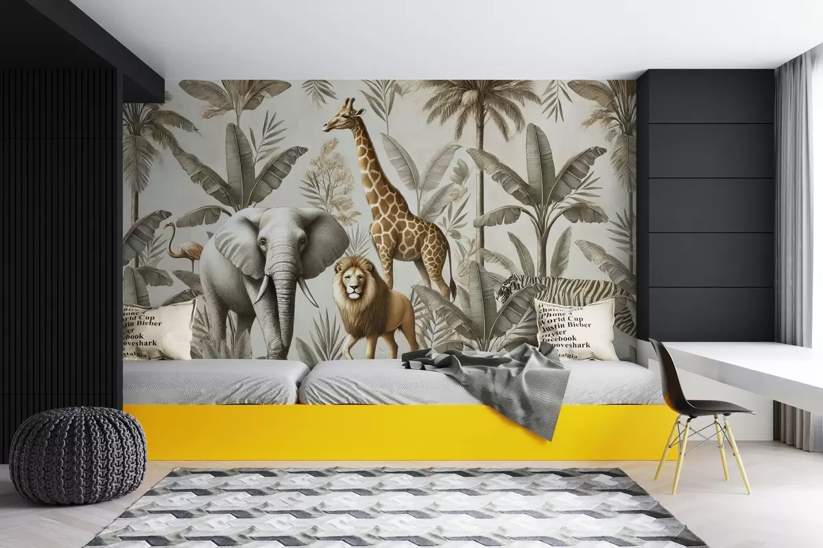 Fototapeten Safari Kindertapete mit tropischer Landschaft und verschiedenen Tieren in eleganten Farben Nr. w01956