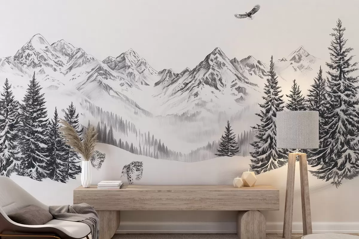 Fototapeten Winterberge, Schneeleoparden, Kiefernwald, Bleistiftzeichnung, fliegender Adler Nr. w02360