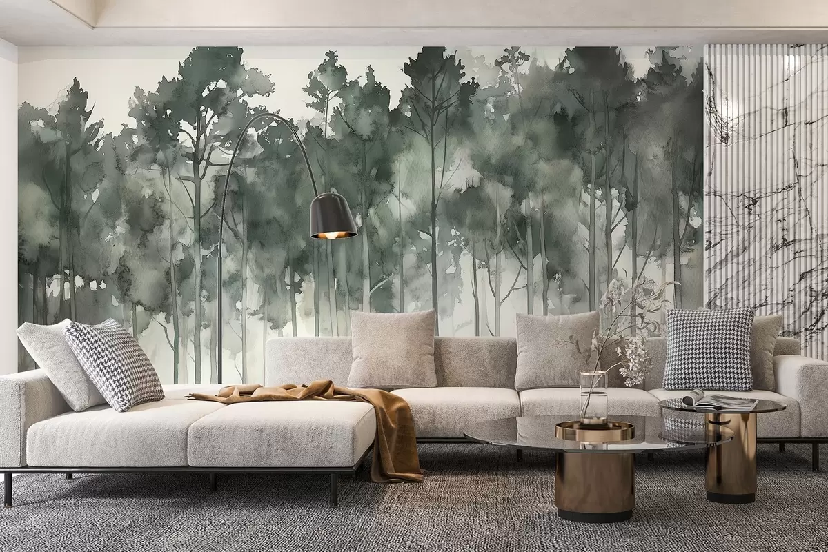 Fototapeten Aquarell-Stil Wald, Kiefern, Natur Landschaft, grüne Farben Nr. w02937