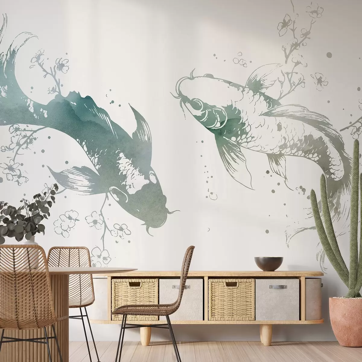Fototapeten Aquarellfisch, orientalischer Stil, Kirschbaum, grüne Farben Nr. w03447v2