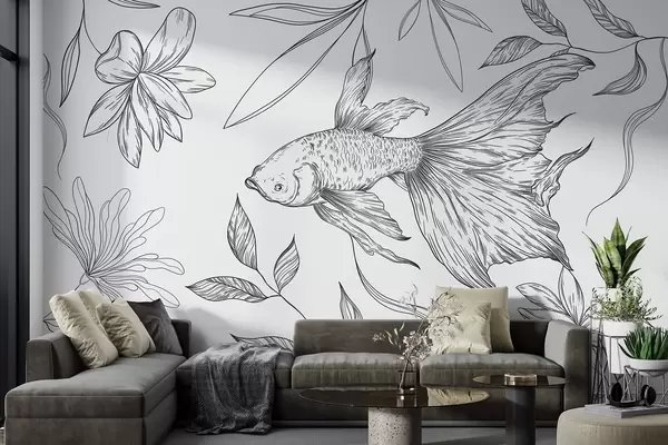Fototapeten Strichzeichnung Fisch mit Blumen, Minimalismus, marine, floral, Tusche-Stil Nr. w03516