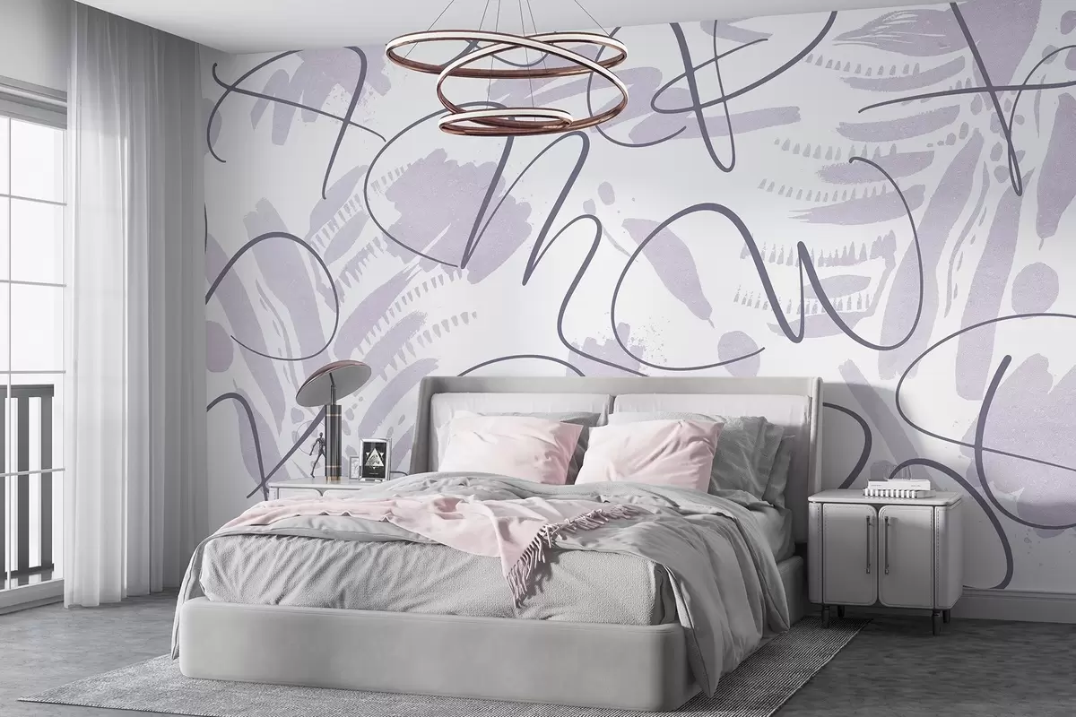 Fototapeten Kalligrafische Abstraktion mit Buchstaben, Pinselstrichen, lila Farbe Nr. w03913v2