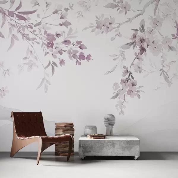 Fototapeten Blühende Zweige, Nachahmung eines Aquarells, lila-rosa Farbtöne Nr. w03935v1