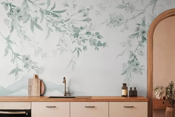 Fototapeten Blühende Zweige, Nachahmung eines Aquarells, Grüntöne Nr. w03935v3