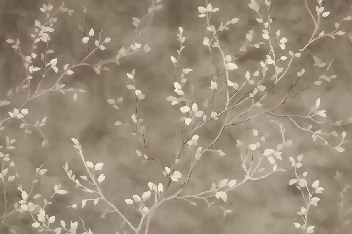 Fototapeten minimalistisches, handgemaltes Tapetendesign aus zarten weißen Zweigen mit zarten Blättern, die sich organisch über einen gedämpften salbeigrünen Hintergrund verzweigen, feine botanische Linienführung in natürlichem Fluss Nr. w03949v1