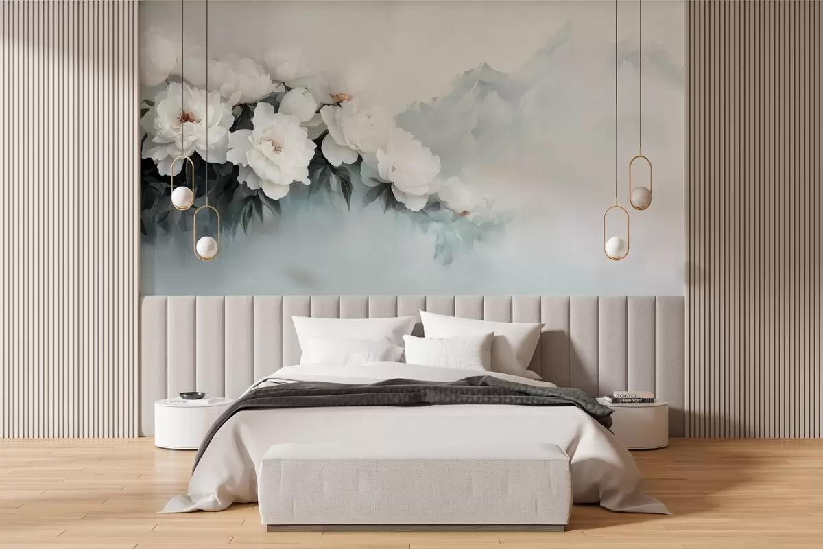 Fototapeten malerische üppige weiße Pfingstrosen vor der Kulisse nebliger Berge Nr. w03965