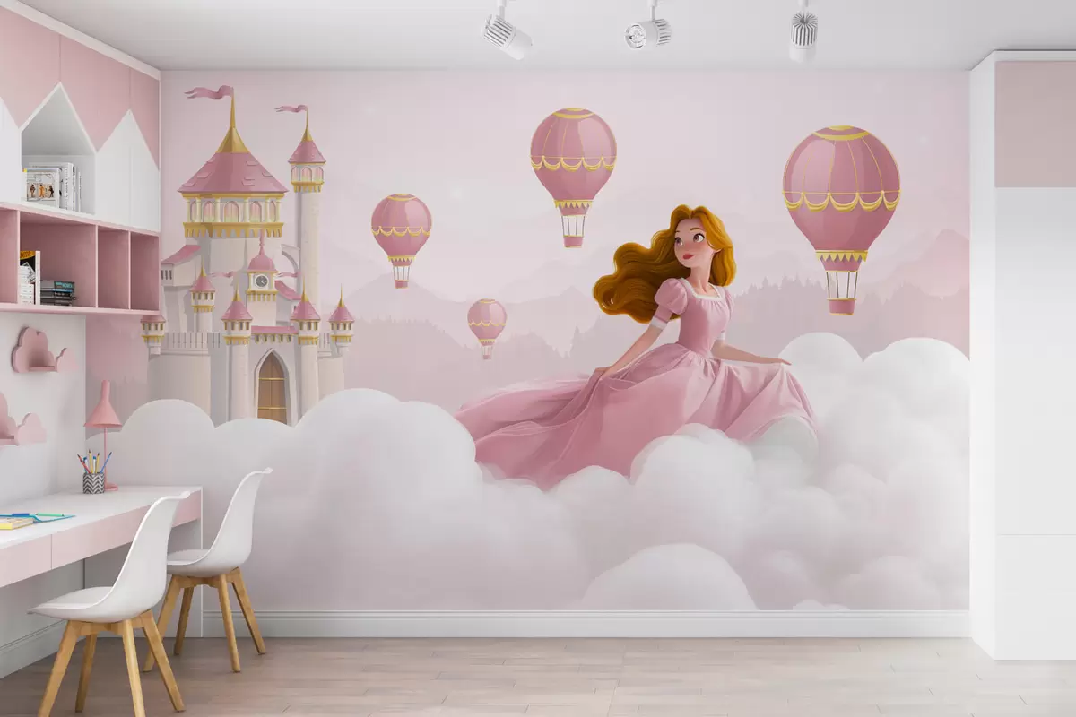 Fototapeten Prinzessin zwischen den Wolken auf dem Hintergrund der Landschaft mit dem Schloss Nr. w04015v1