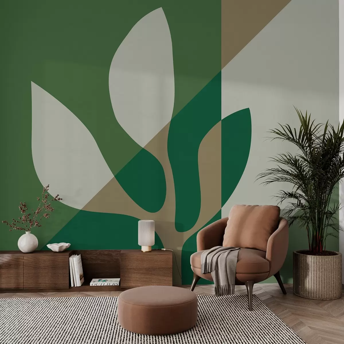 Fototapeten abstrakte Grafik Pflanze auf dem Hintergrund der Geometrie in grün und ocker Farben Nr. w04028