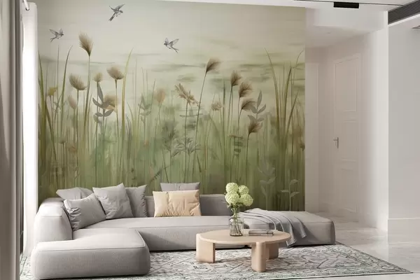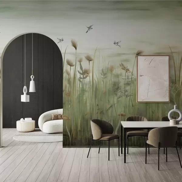 Fototapeten Graslandschaft mit Schwalben gegen weichen Himmel Nr. w04258v1