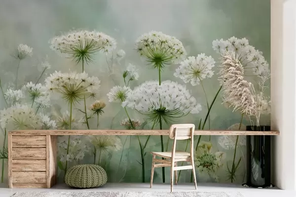 Fototapeten zarte weiße Wildblumen Queen Anne, im malerischen Stil, Grüntöne Nr. w04313