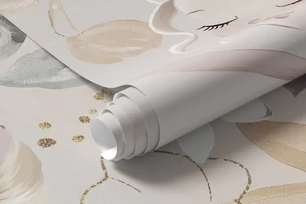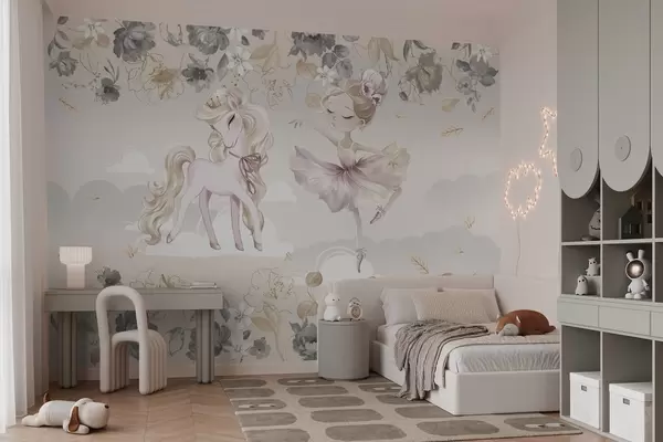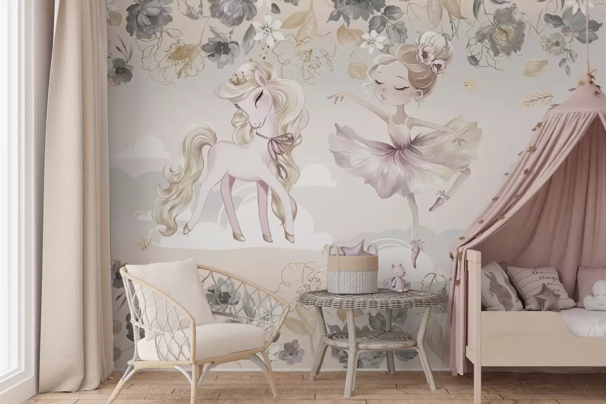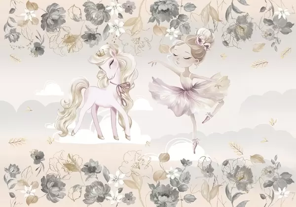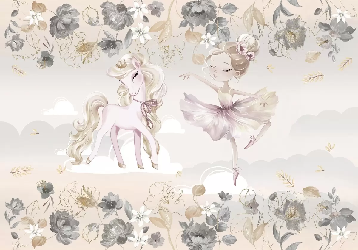 Fototapeten Schneeweißes Pony und Ballerina zwischen Blumen und Wolken Nr. w04419