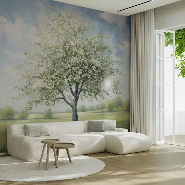 Fototapete Ein einsamer Baum in einem Feld mit weißen Blüten w04445