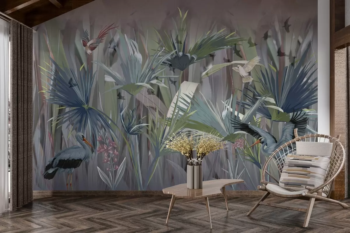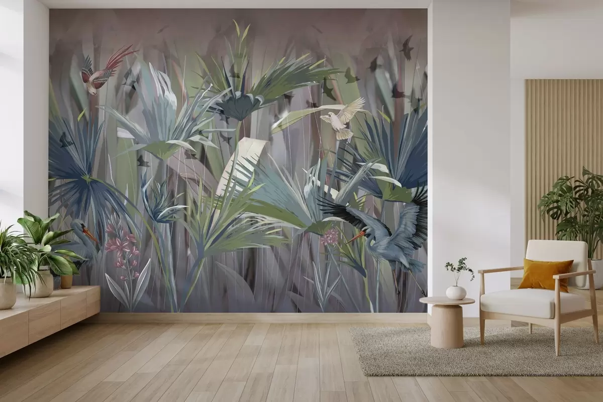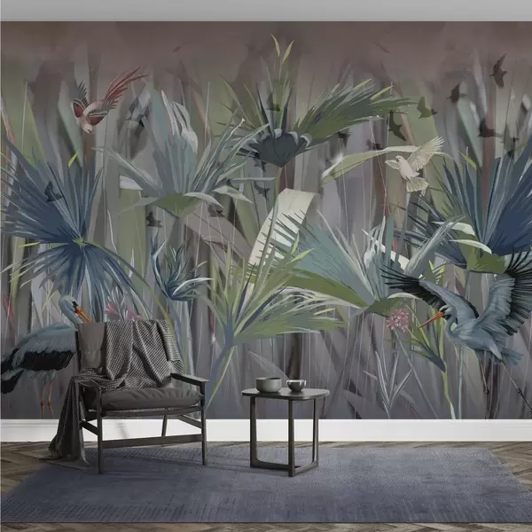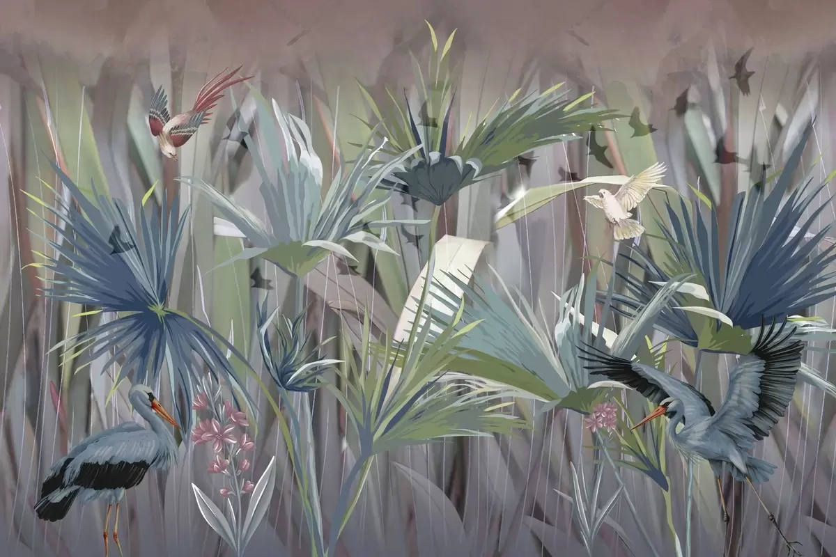 Fototapeten Exotische Vögel zwischen Palmenblättern und Blumen Nr. w04458