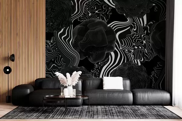 Fototapete Abstrakte organische Formen im 3D-Stil in Schwarztönen mit weißen Streifen w04628