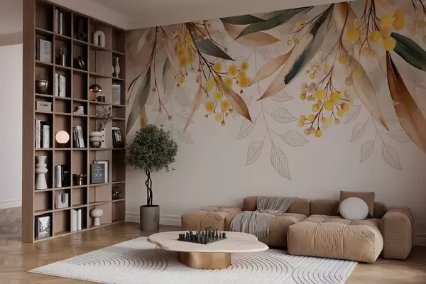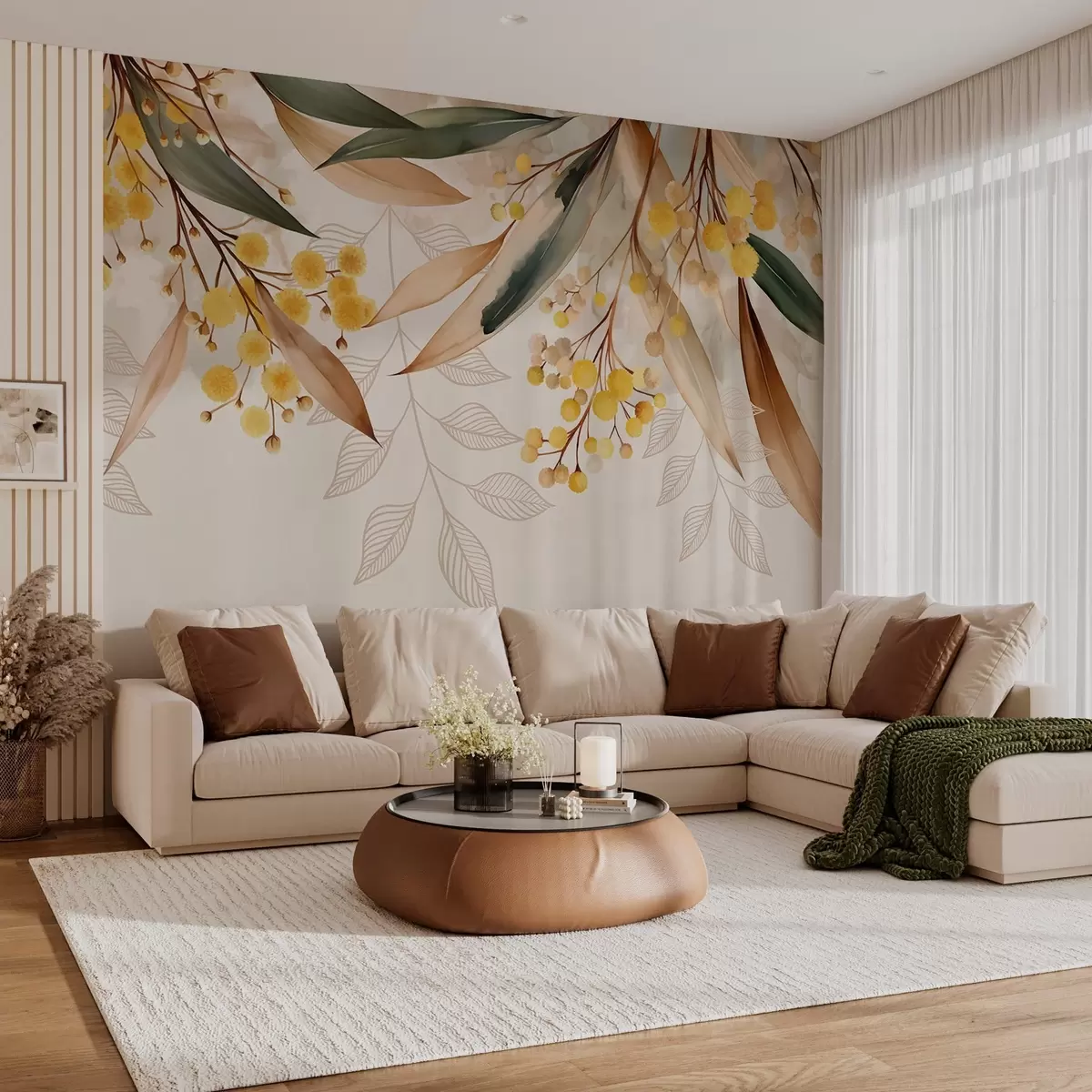 Fototapete Blüten und Blätter der Mimose, die im Aquarellstil von oben herabfallen w04880