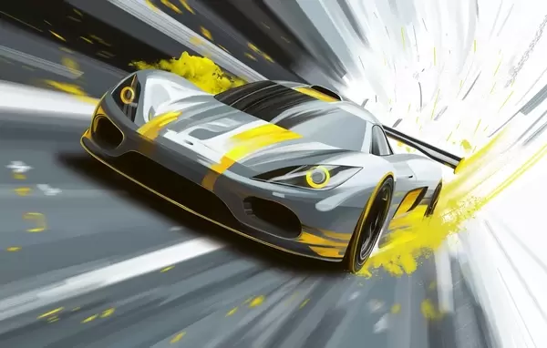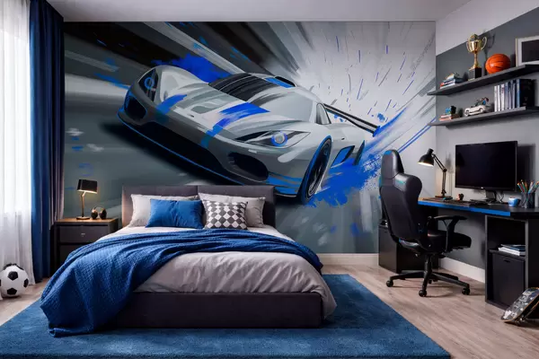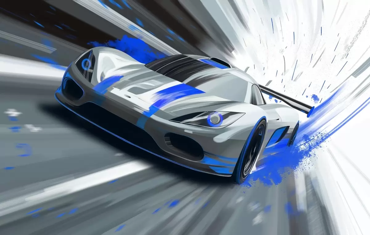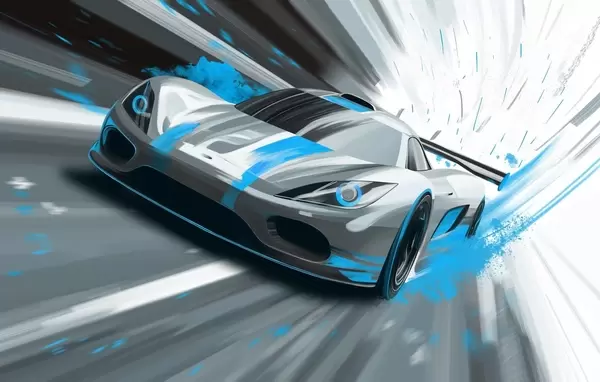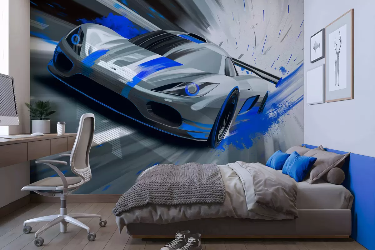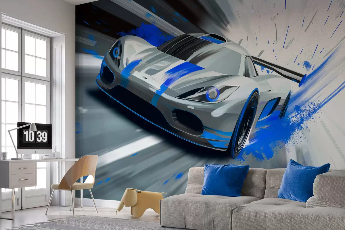 Fototapeten Dynamischer Sportwagen im digitalen Zeichenstil mit blauen Akzenten Nr. w05069