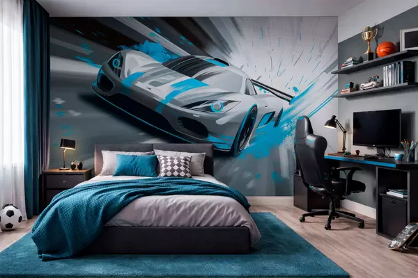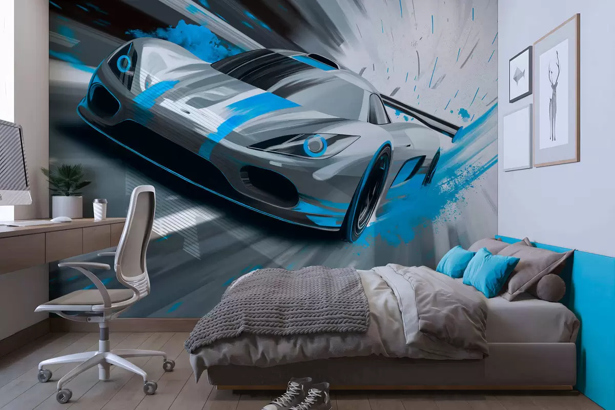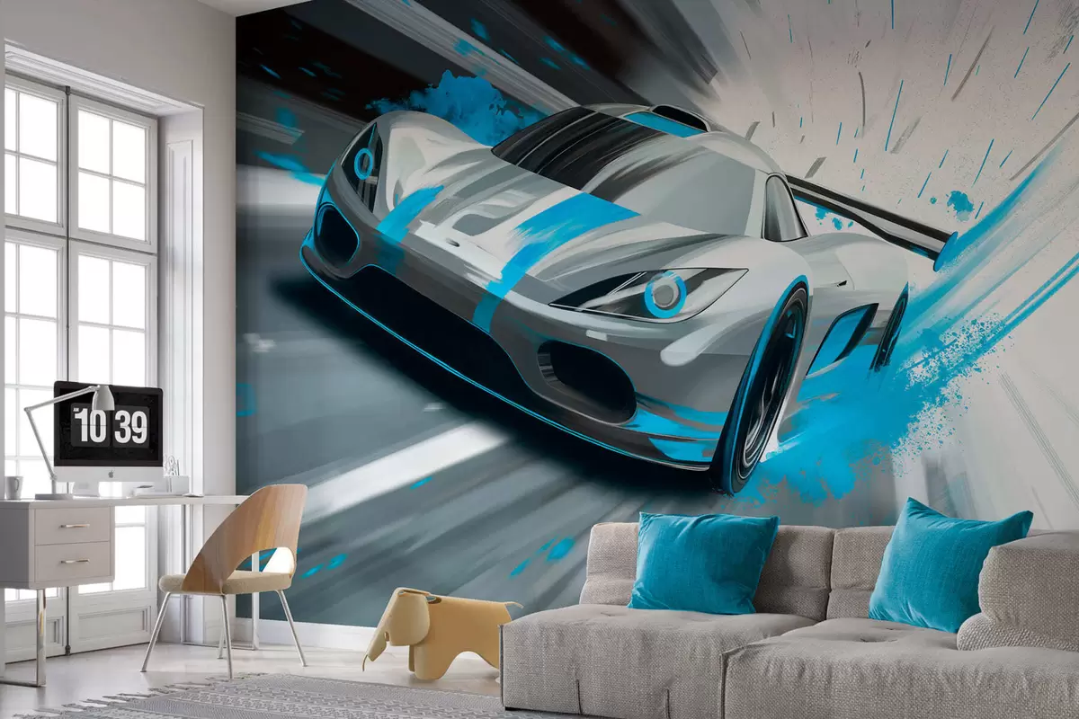 Fototapeten Dynamischer Sportwagen im digitalen Zeichenstil mit türkisfarbenen Akzenten Nr. w05069v3