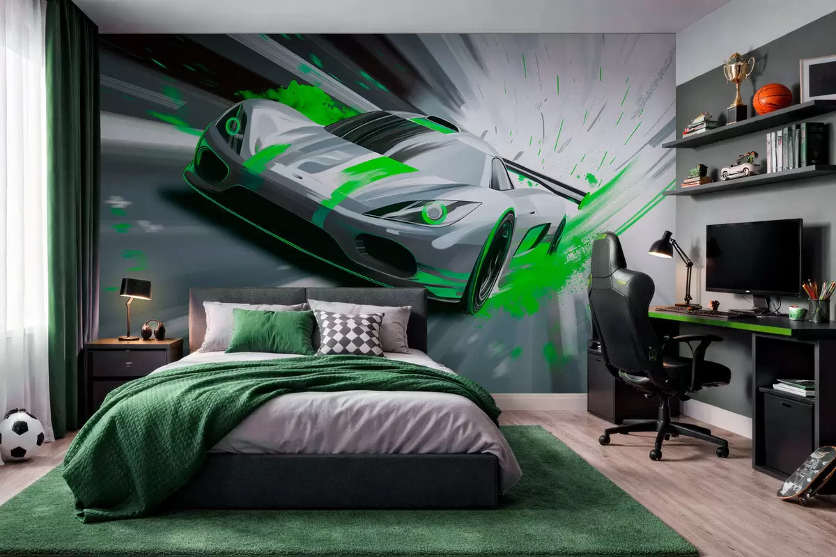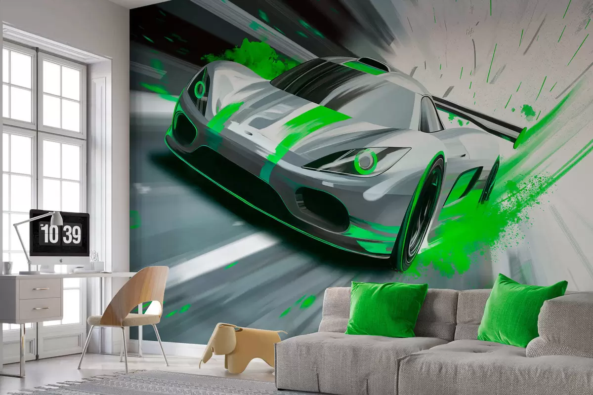 Fototapeten Dynamischer Sportwagen im digitalen Zeichenstil mit grünen Akzenten Nr. w05069v4