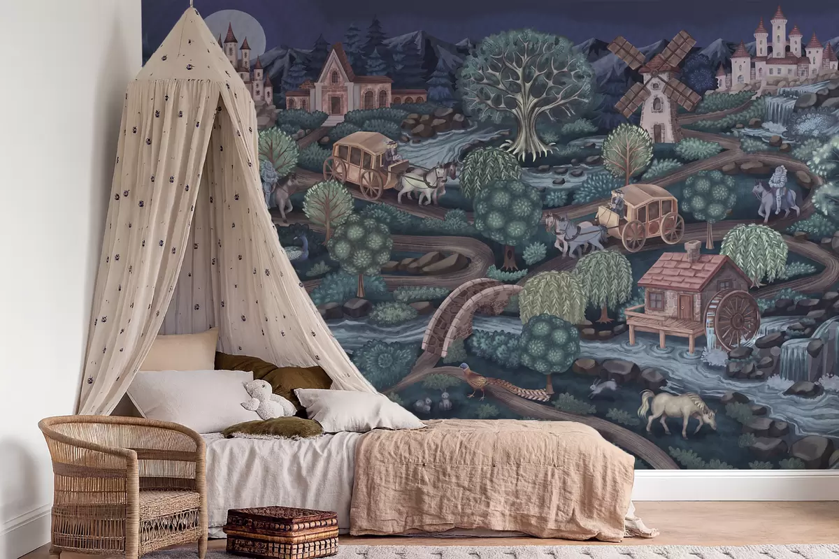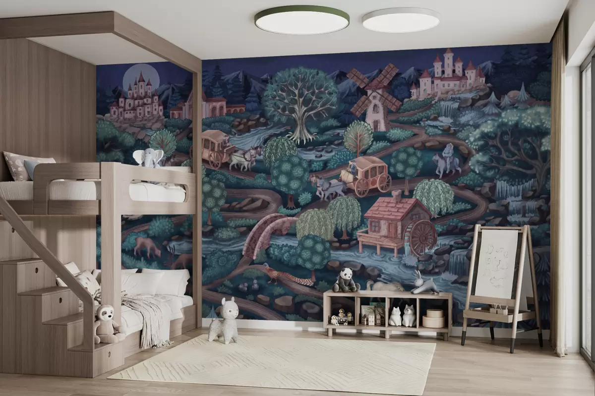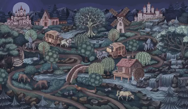 Fototapeten Nachtfeen-Szene mit Burgen, Mühlen und Wald Nr. w05091