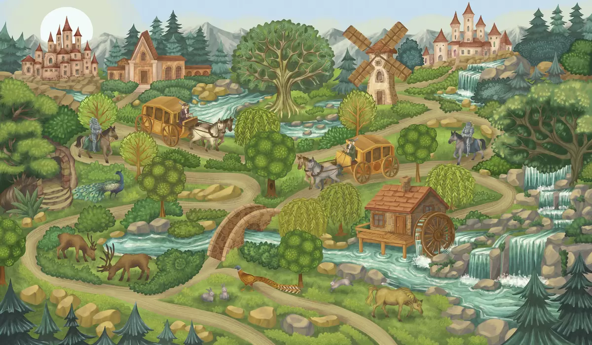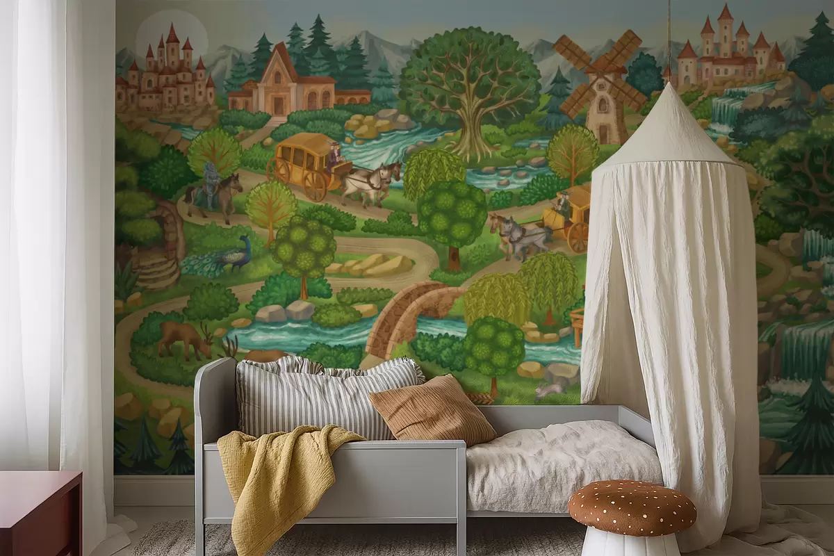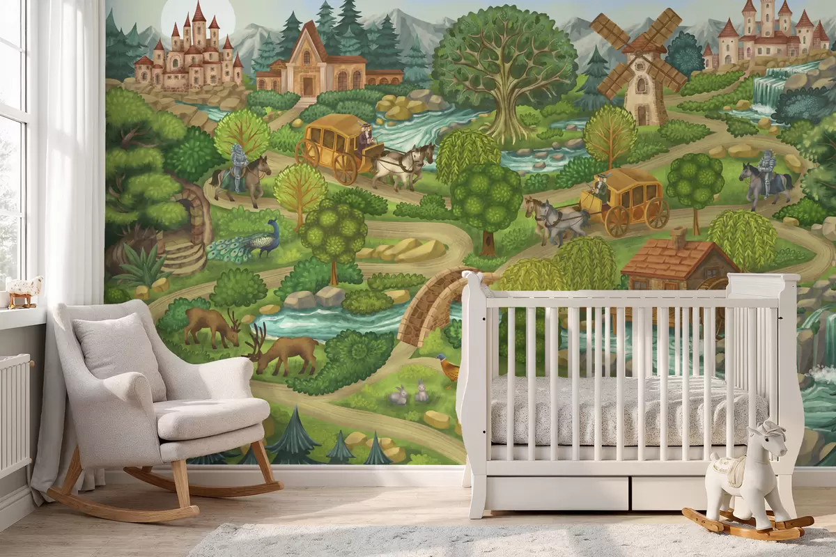 Fototapeten Märchenhafte Illustration mit Burgen, Wald, Flüssen und Reisenden Nr. w05091v1