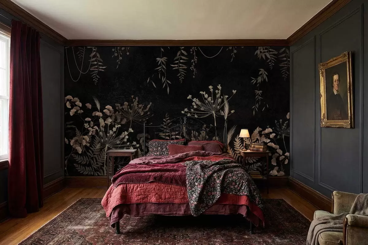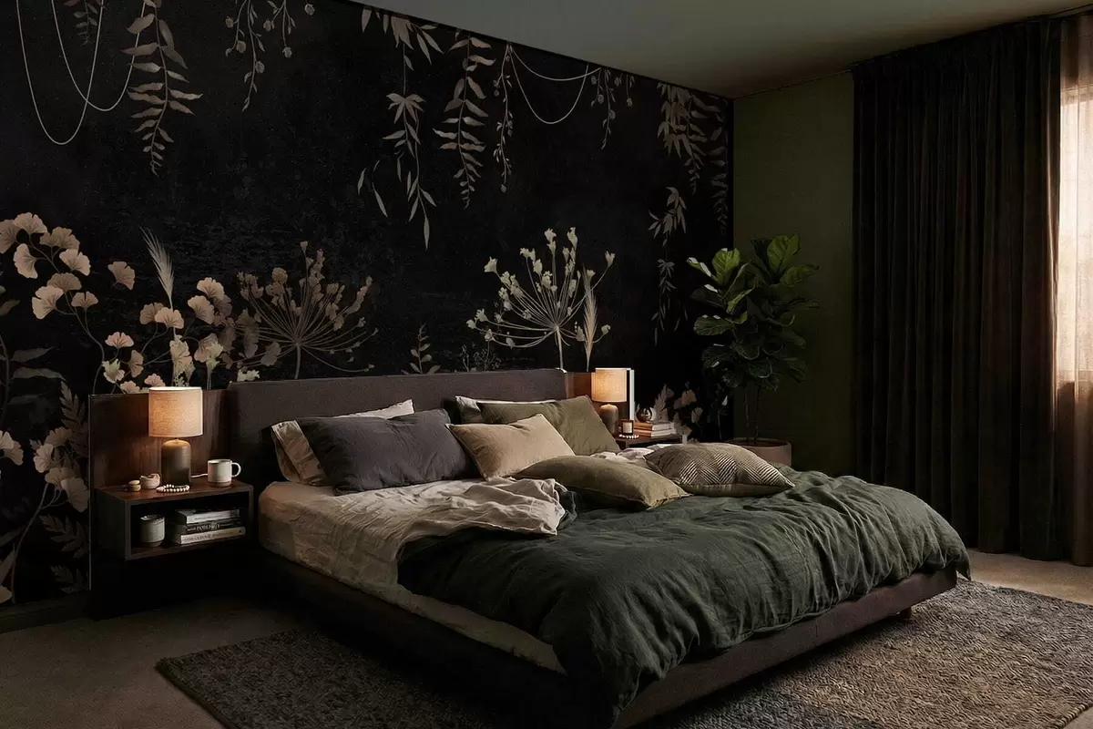 Fototapeten Dunkles botanisches Muster mit Blumen und Blättern Nr. w05092