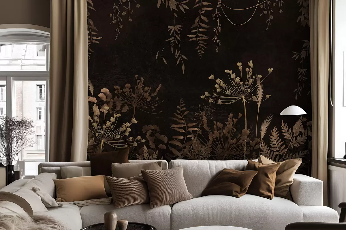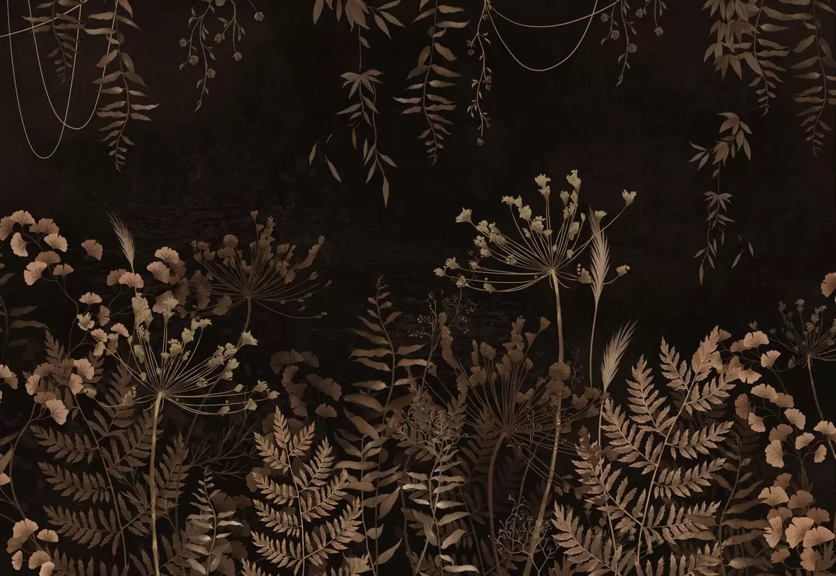 Fototapeten Dunkles botanisches Muster mit Blumen und Gräsern Nr. w05092v3
