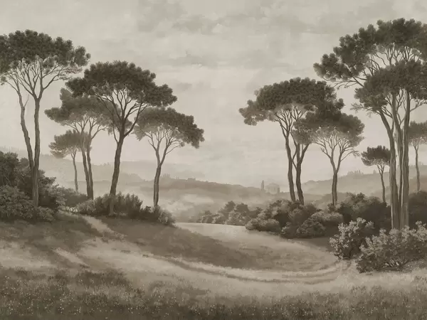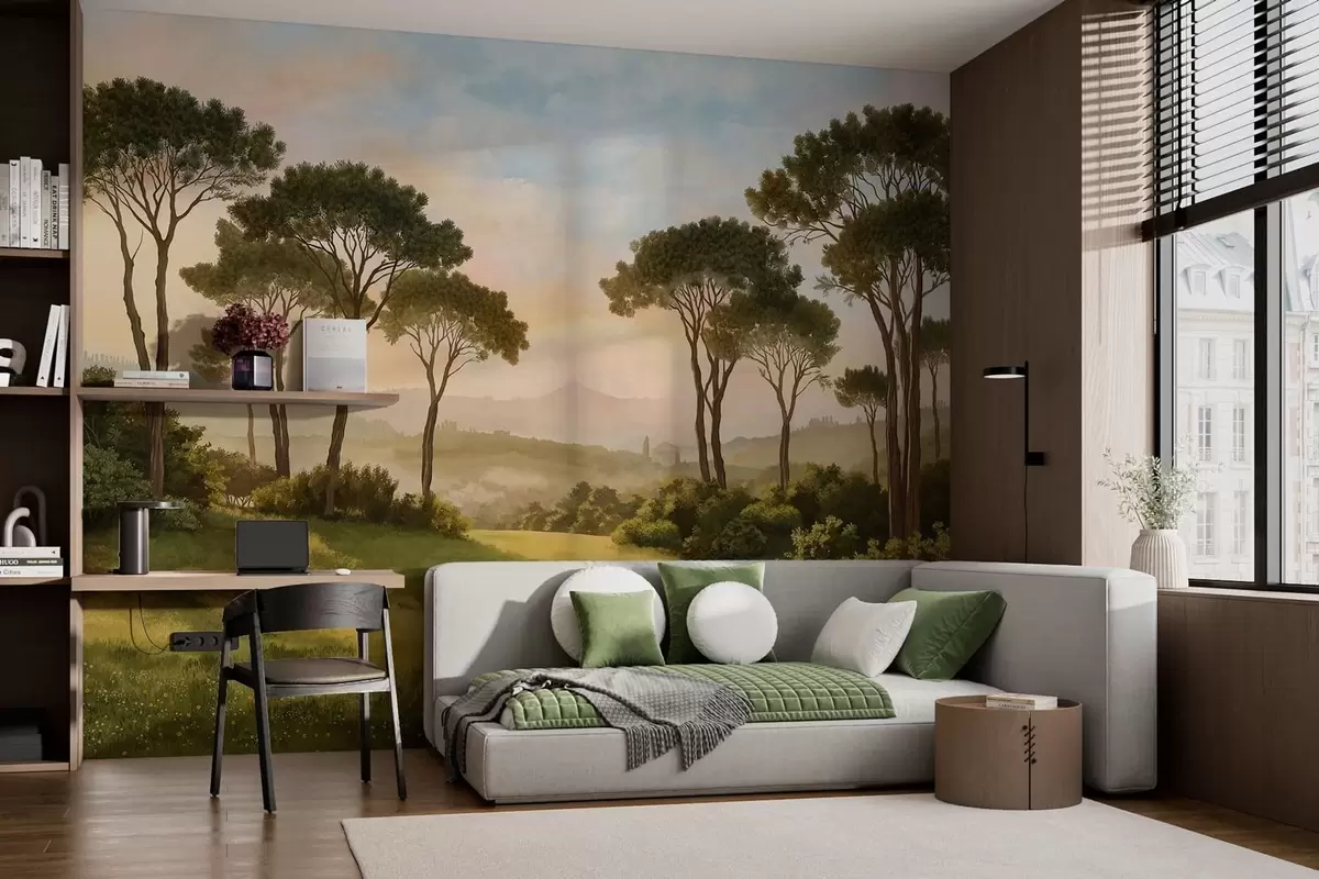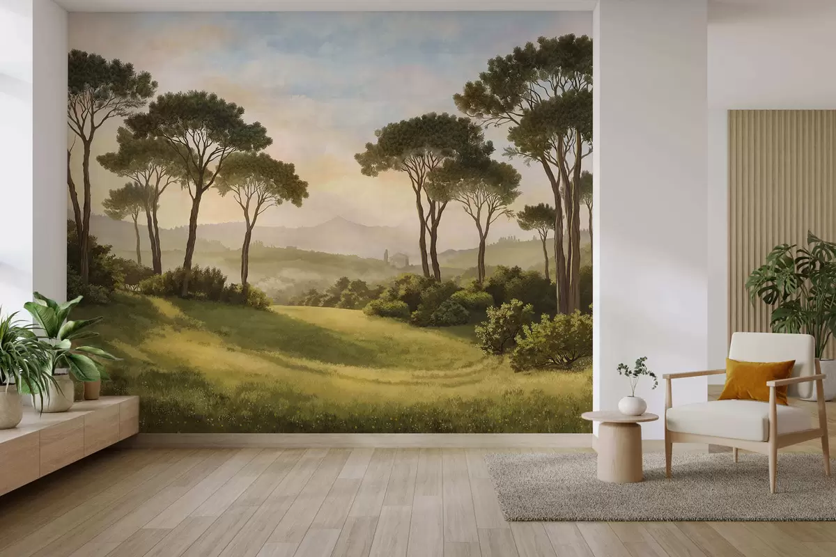 Fototapeten Landschaft mit Bäumen im warmen Licht der untergehenden Sonne Nr. w05122