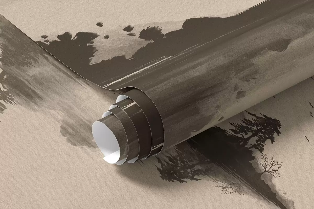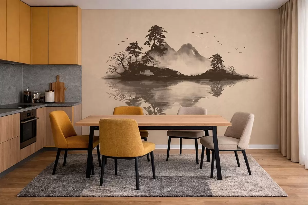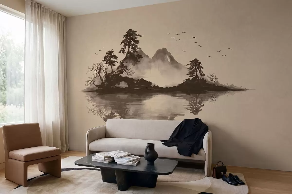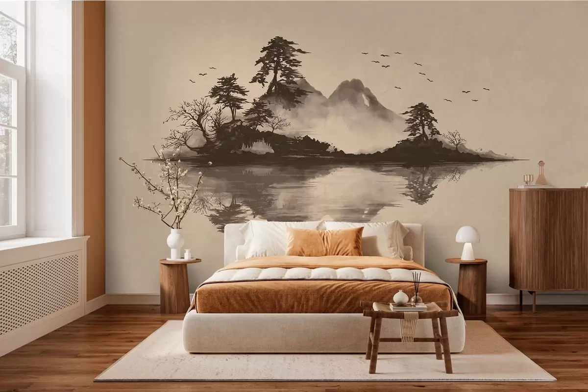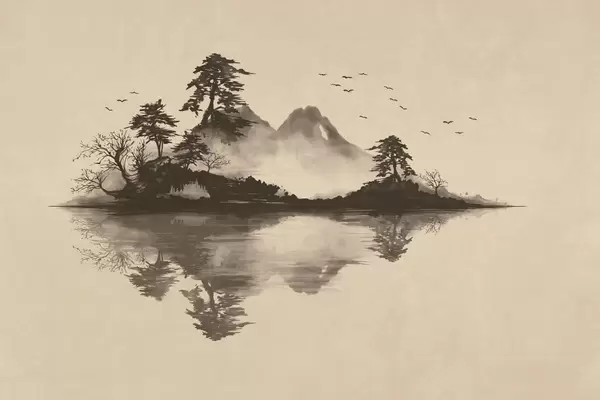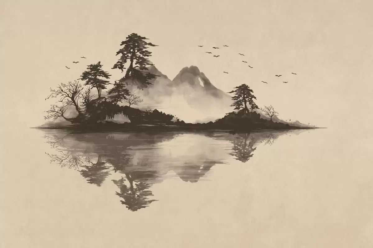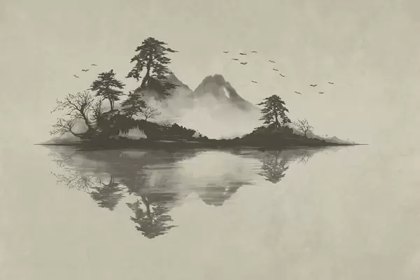 Fototapeten Sumi-e-Berglandschaft mit Kiefern und Spiegelung Nr. w05124