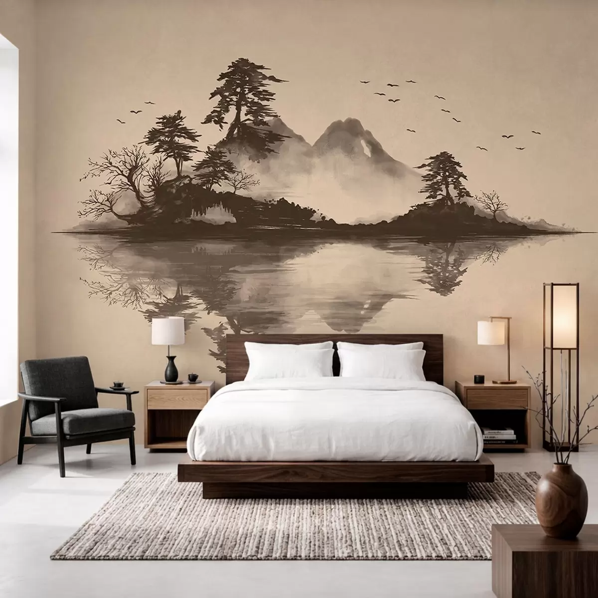 Fototapeten Sumi-e-Berglandschaft mit Kiefern und Spiegelung Nr. w05124