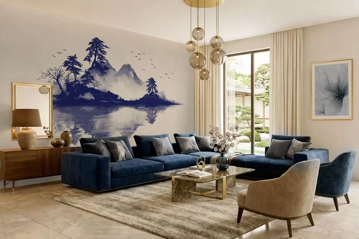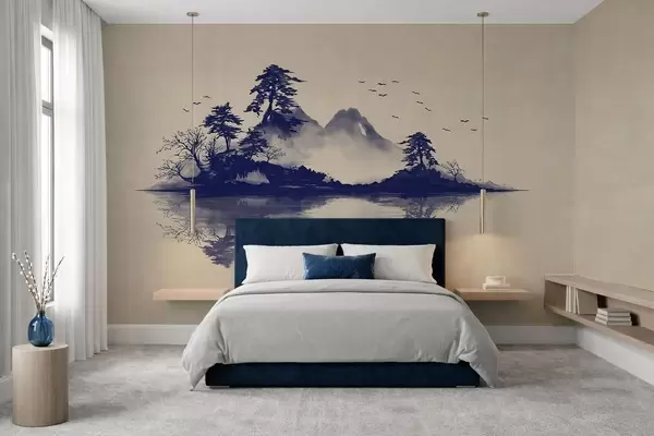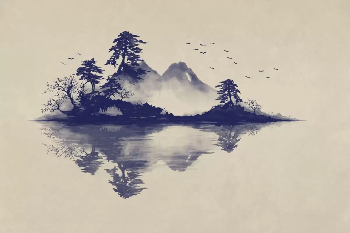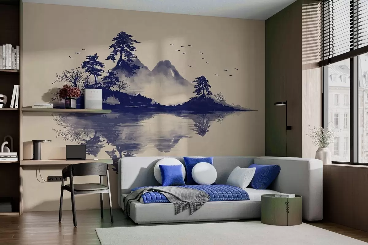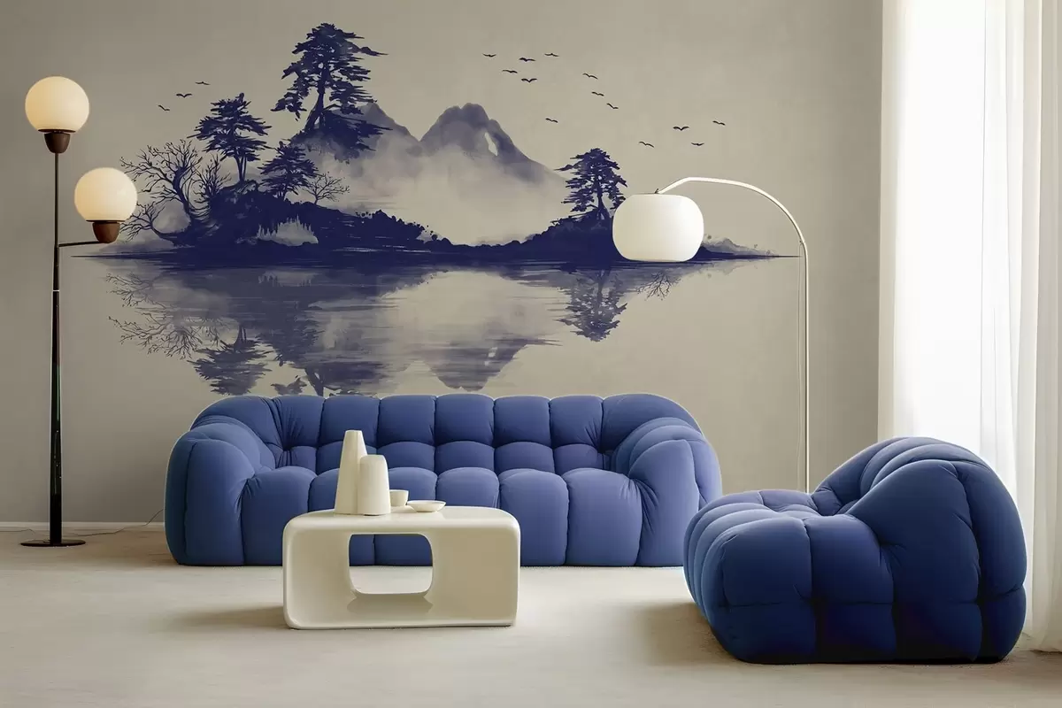 Fototapeten Sumi-e-Berglandschaft in Blautönen Nr. w05124v2