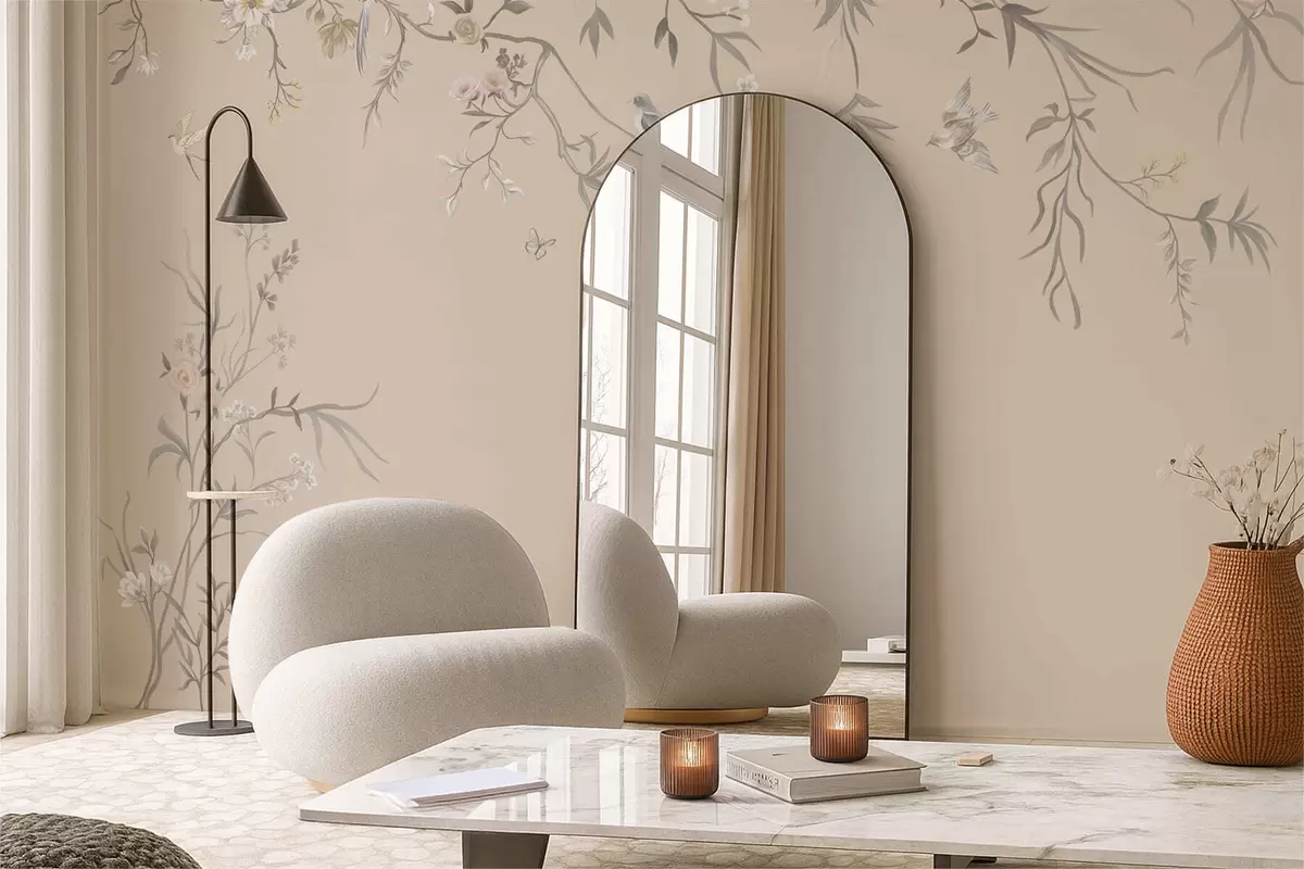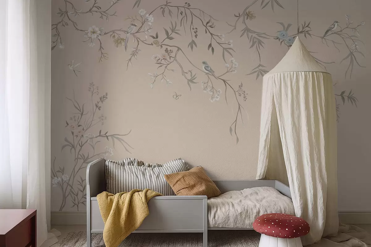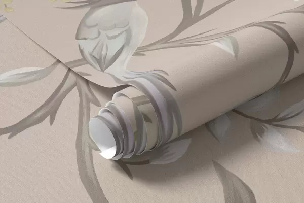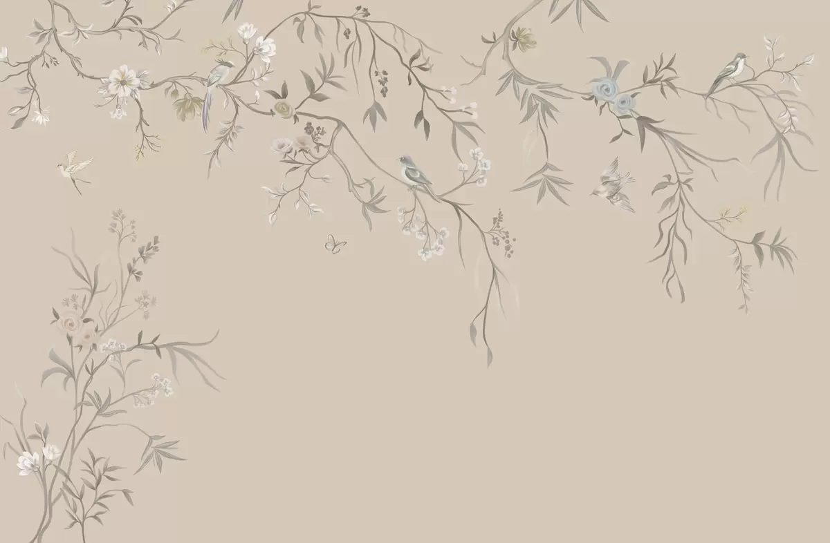 Fototapeten Blumenzweige mit Vögeln auf warmem beigem Hintergrund Nr. w05127v1
