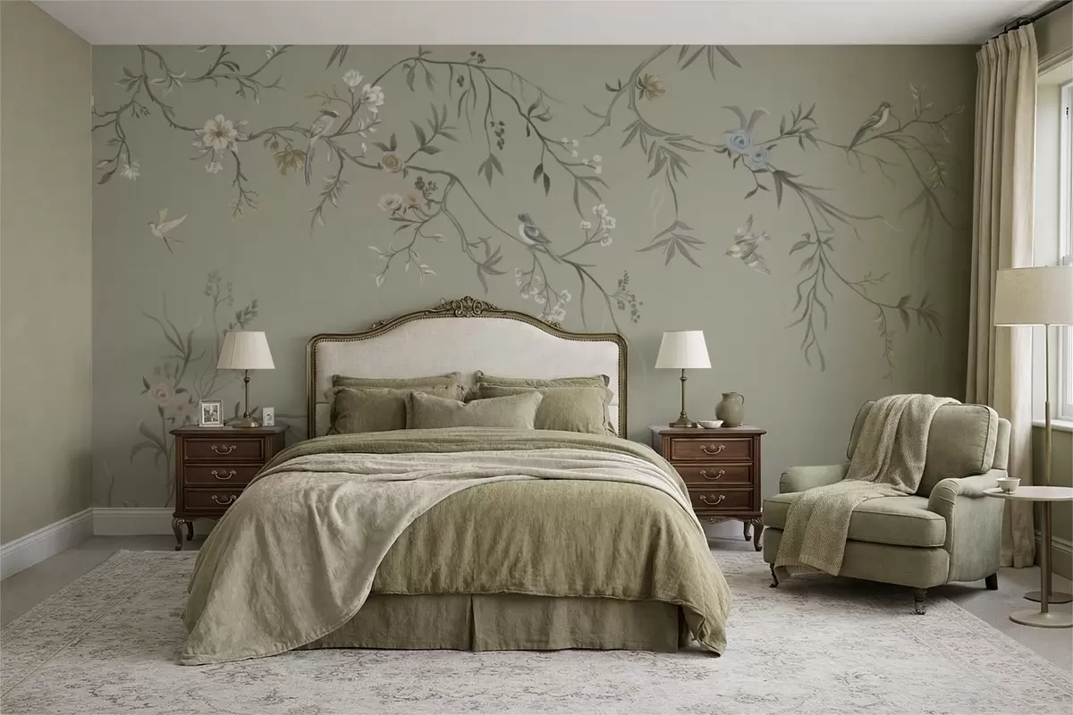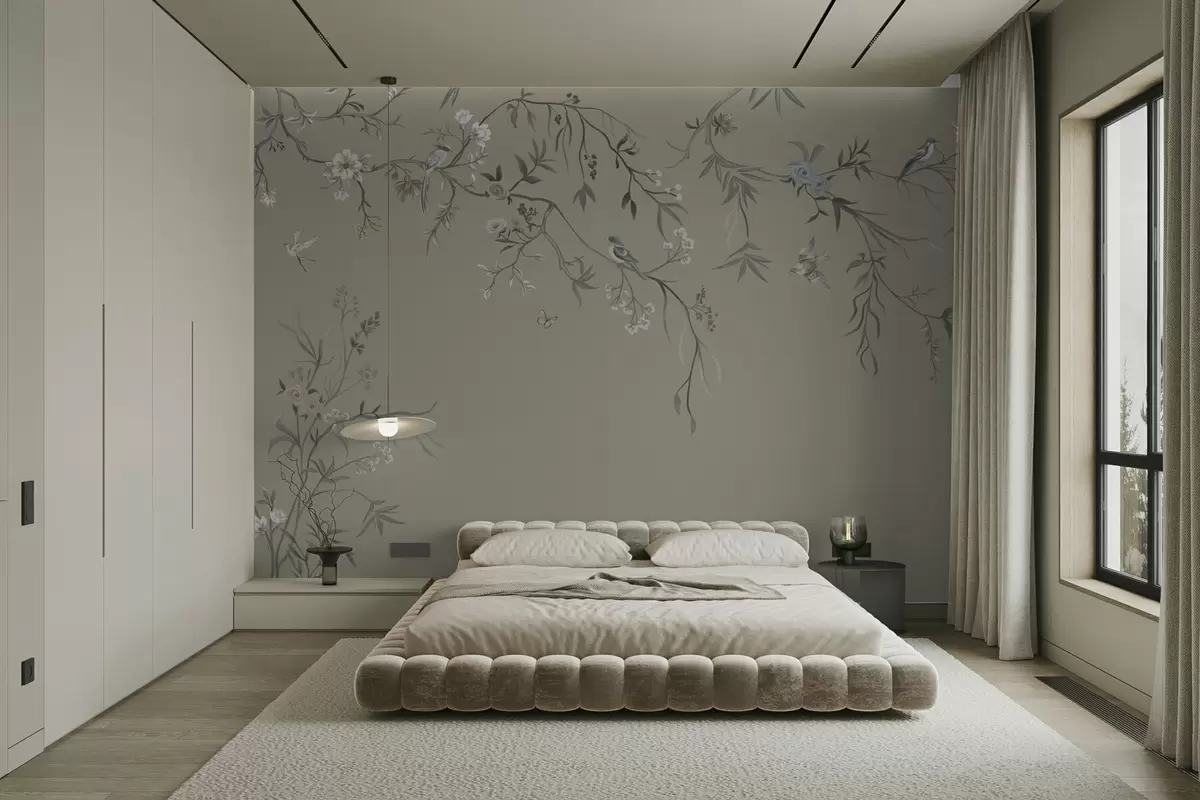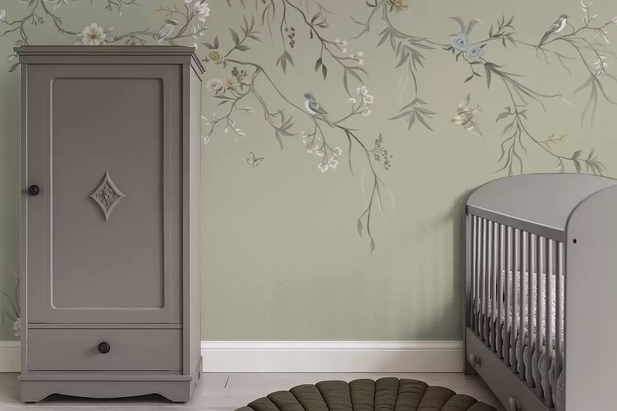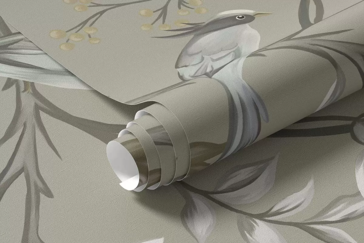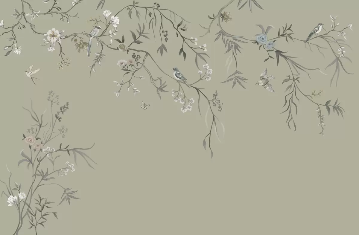 Fototapeten Blumenmuster mit Vögeln auf kühlem Hintergrund Nr. w05127v6