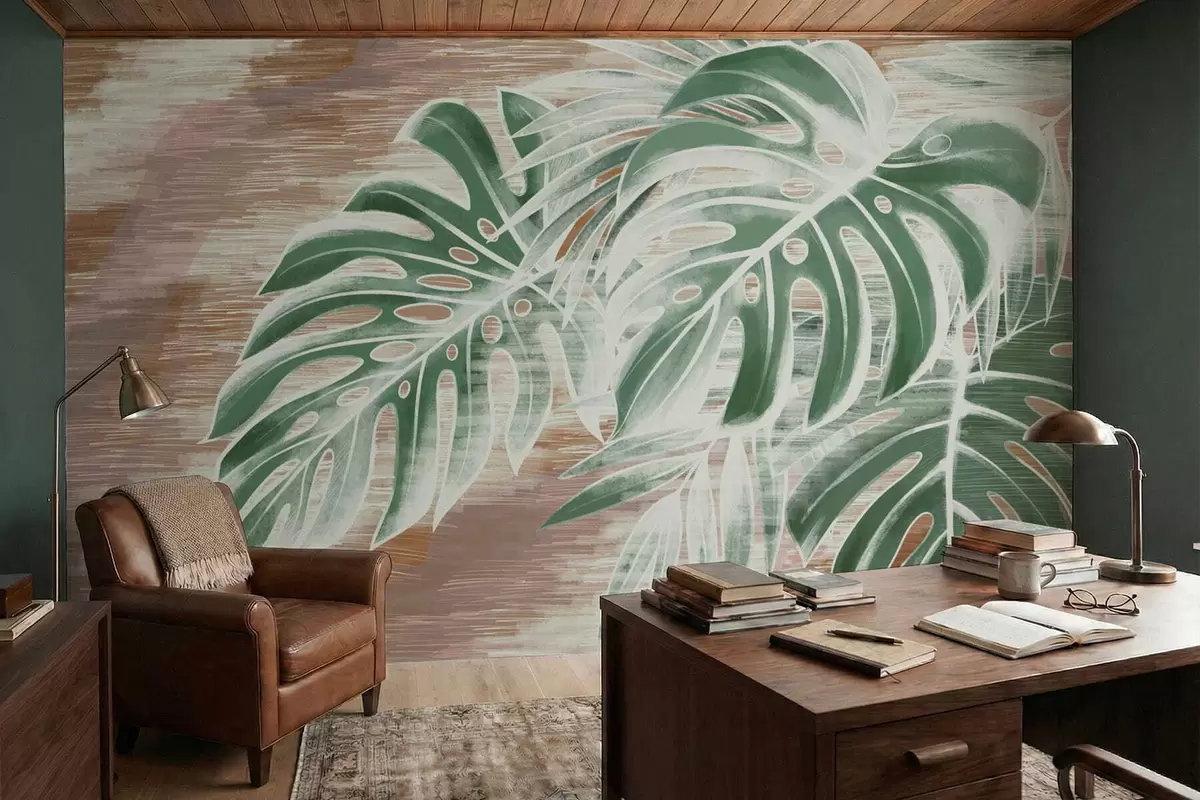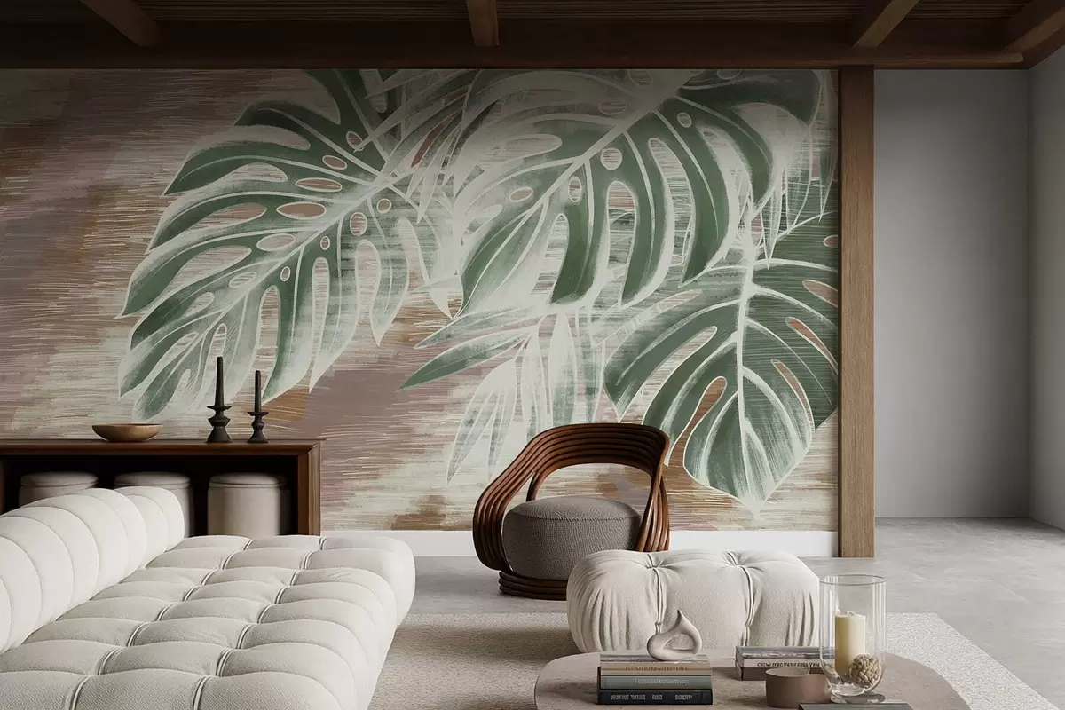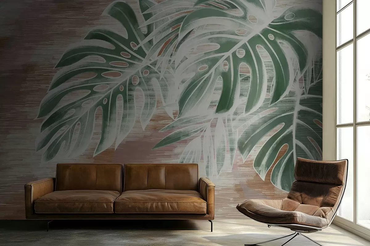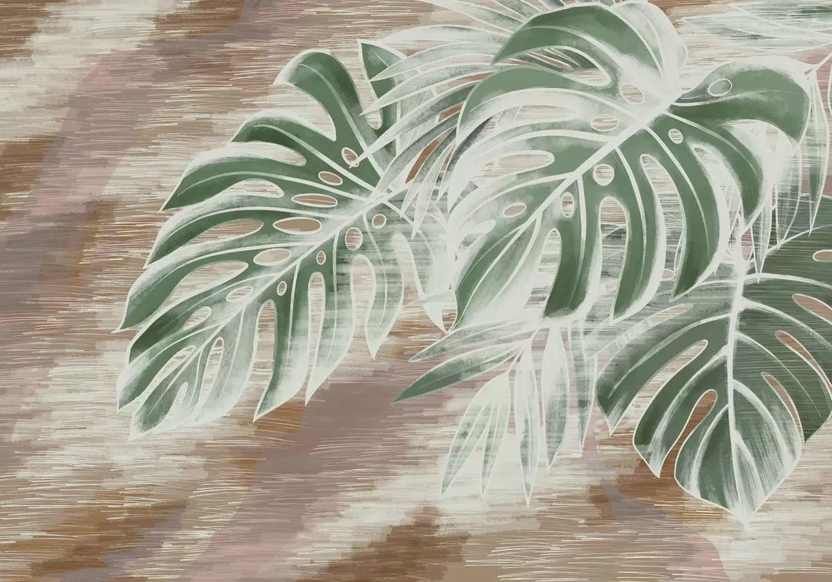 Fototapeten Grüne Blätter auf einem warm strukturierten abstrakten Untergrund Nr. w05130v3