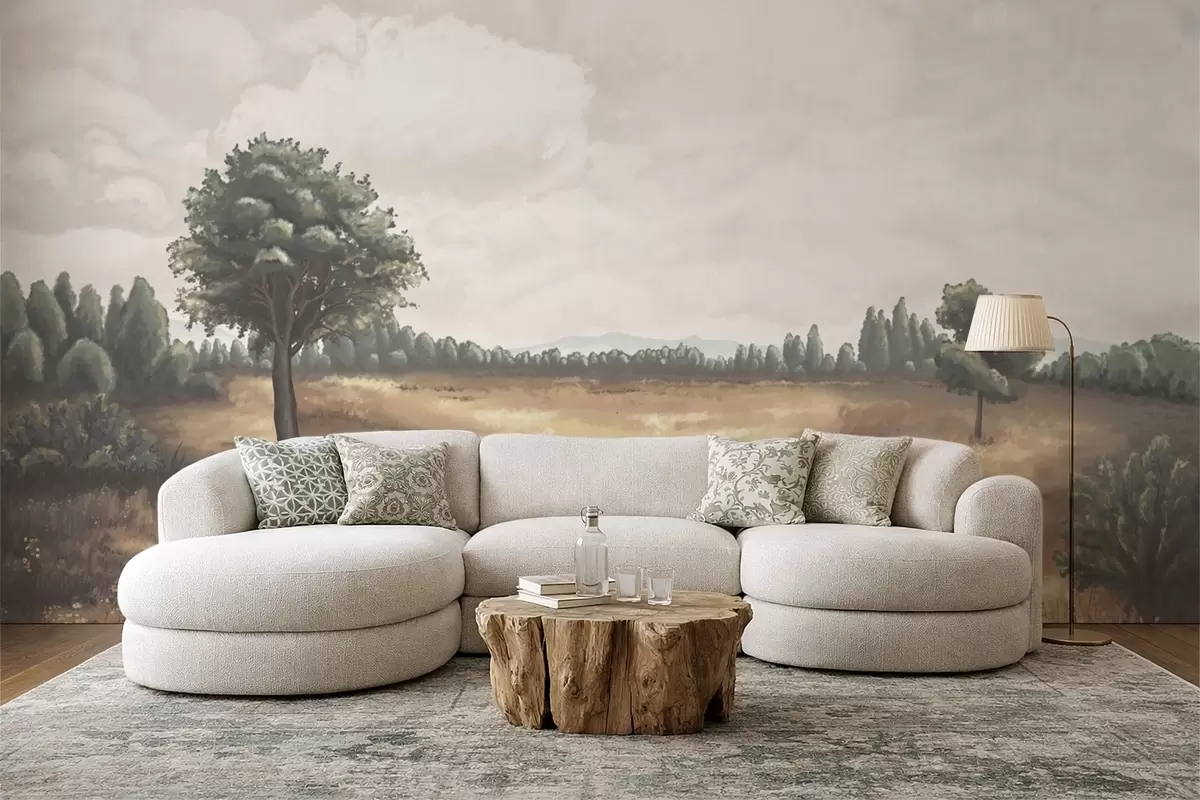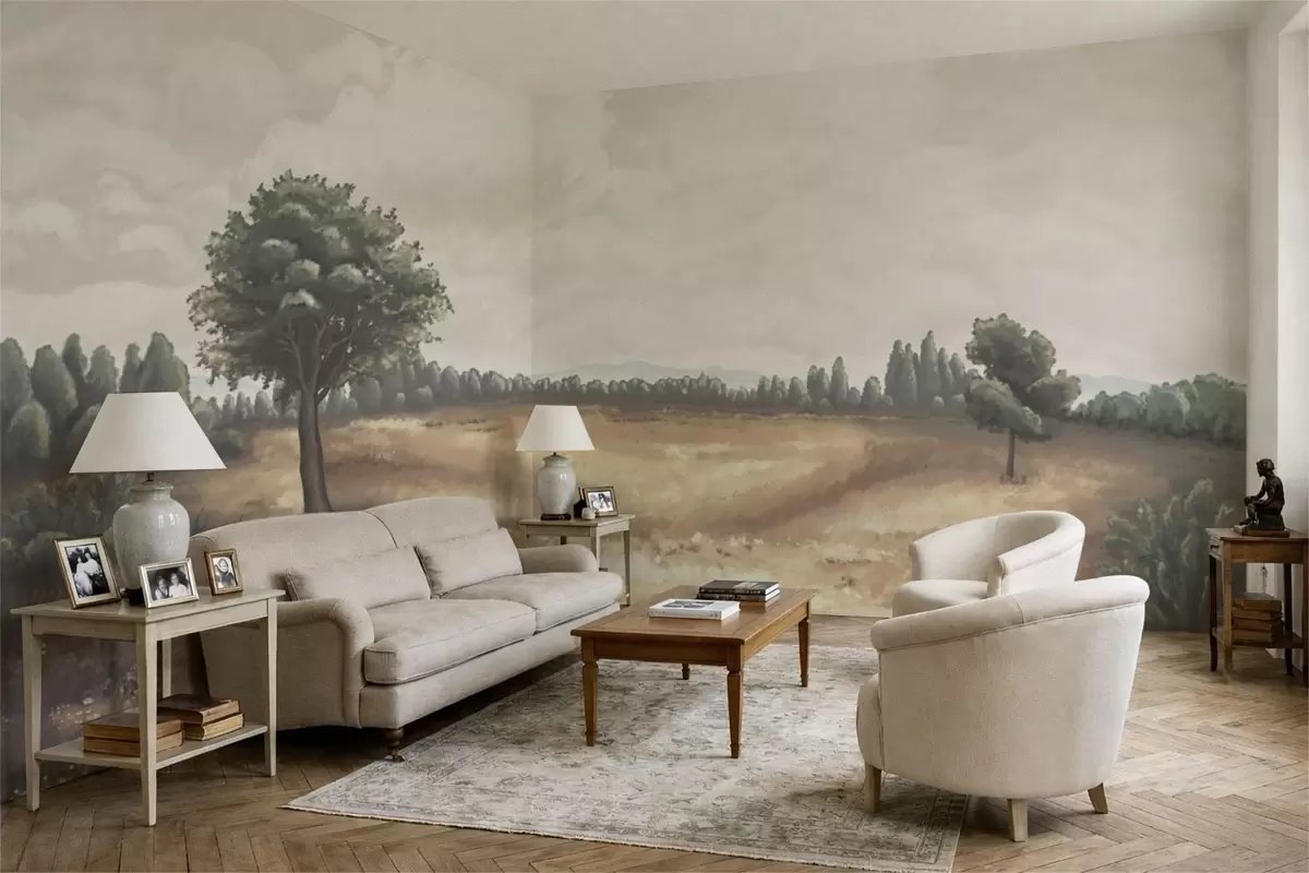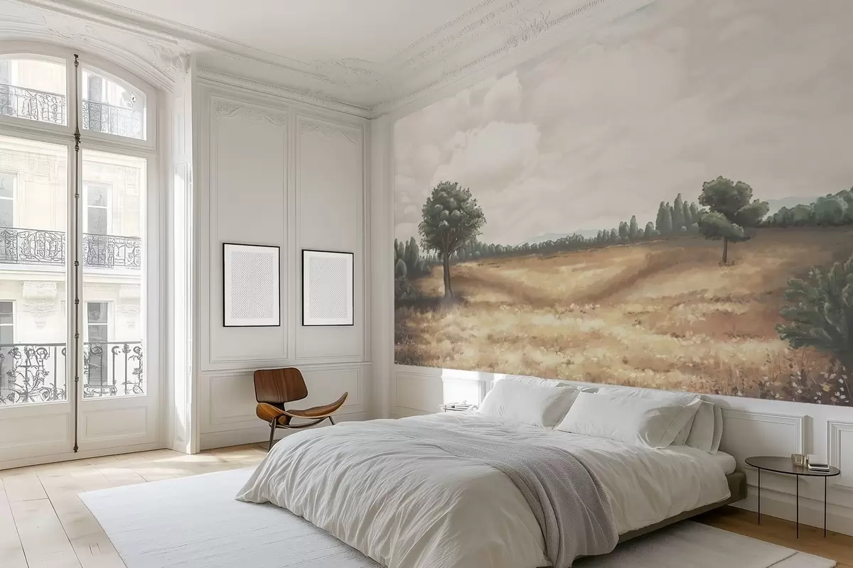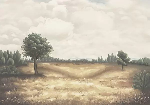 Fototapeten Gemalte Landschaft mit Bäumen und offenem Feld Nr. w05131
