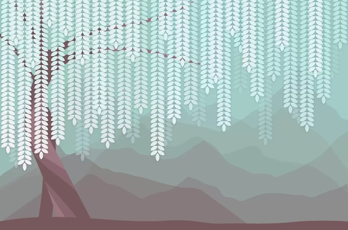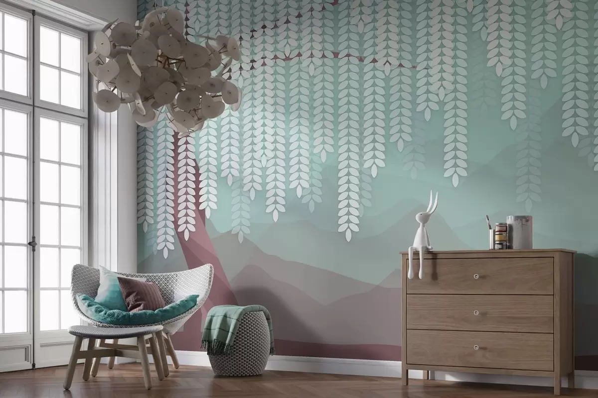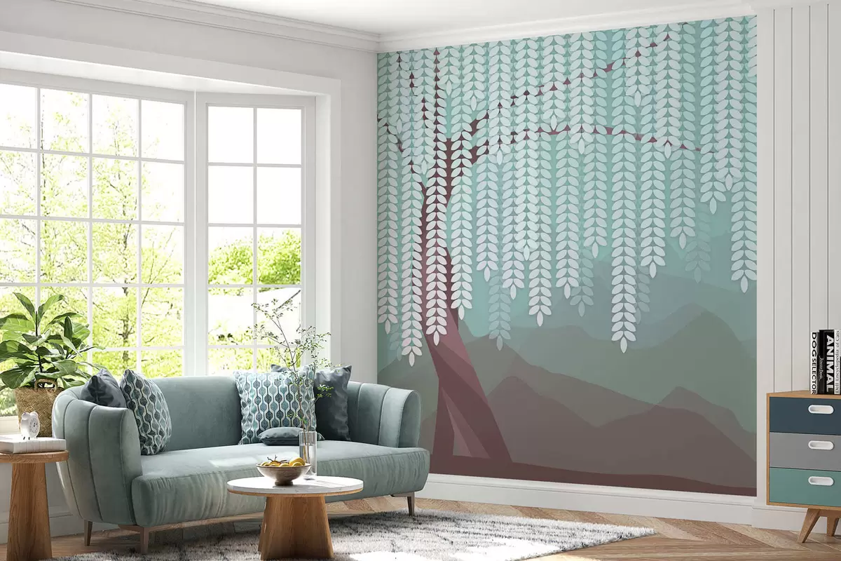 Fototapeten Stilisierter Weidenbaum mit herabhängenden Blättern vor dem Hintergrund minimalistischer Berge in Schokoladen- und Türkistönen Nr. w05232v1