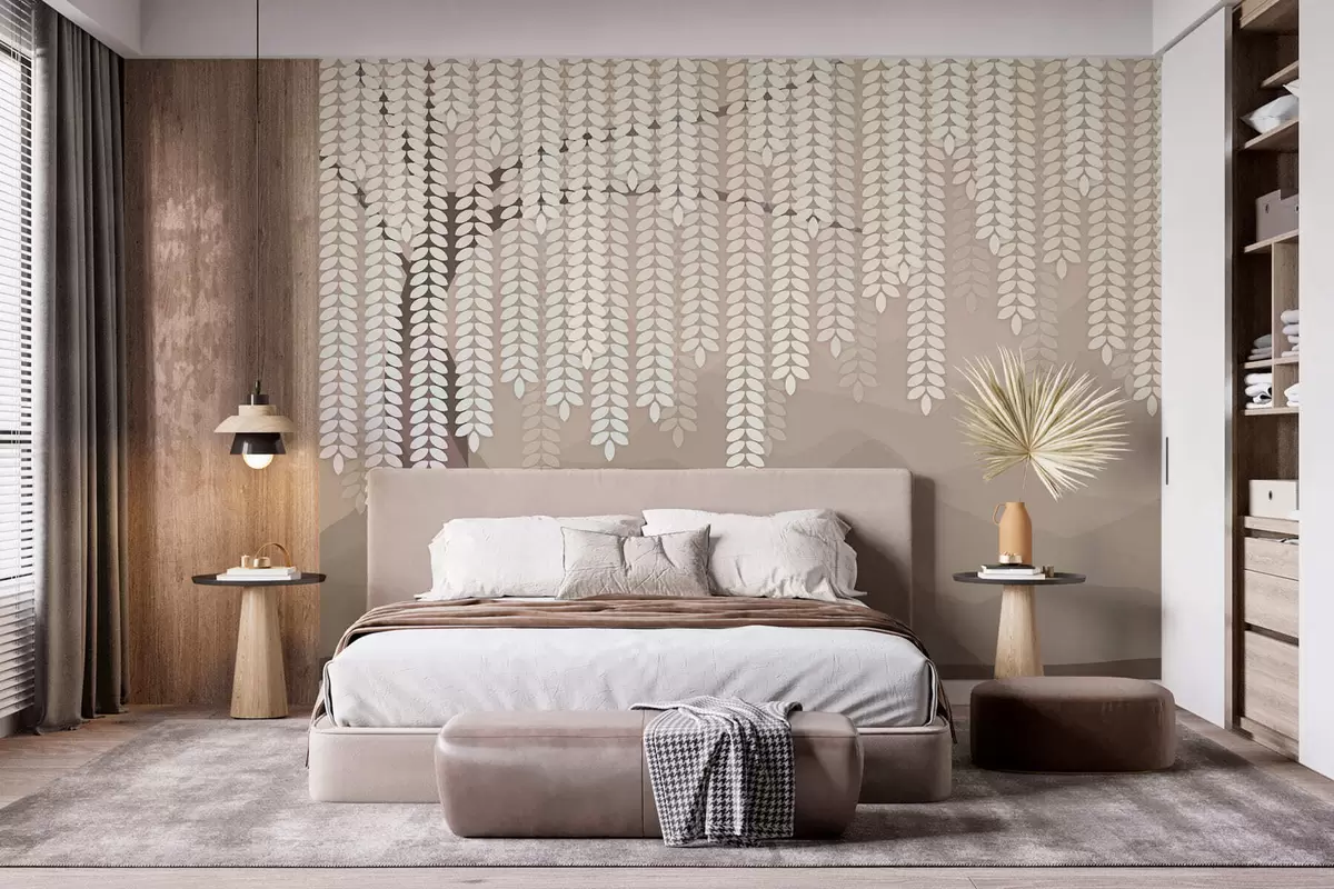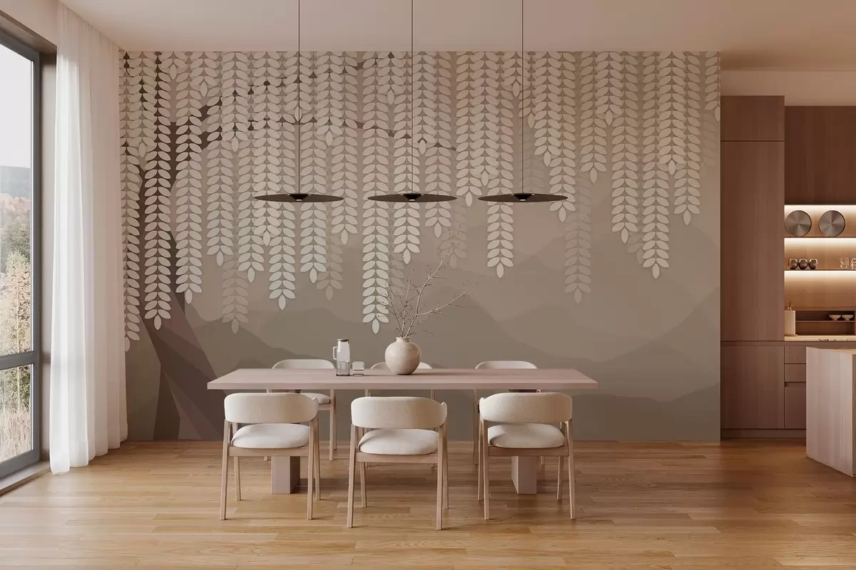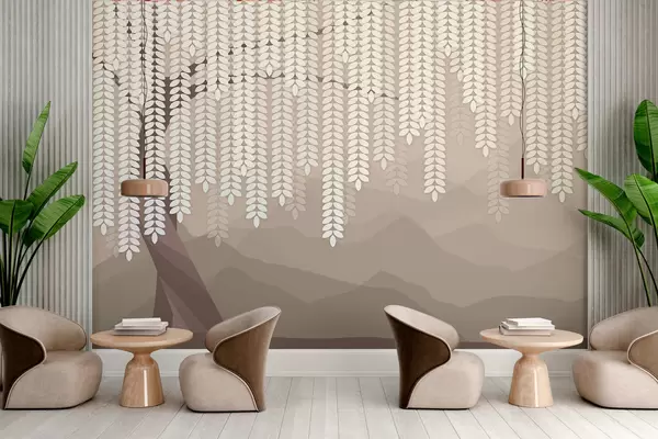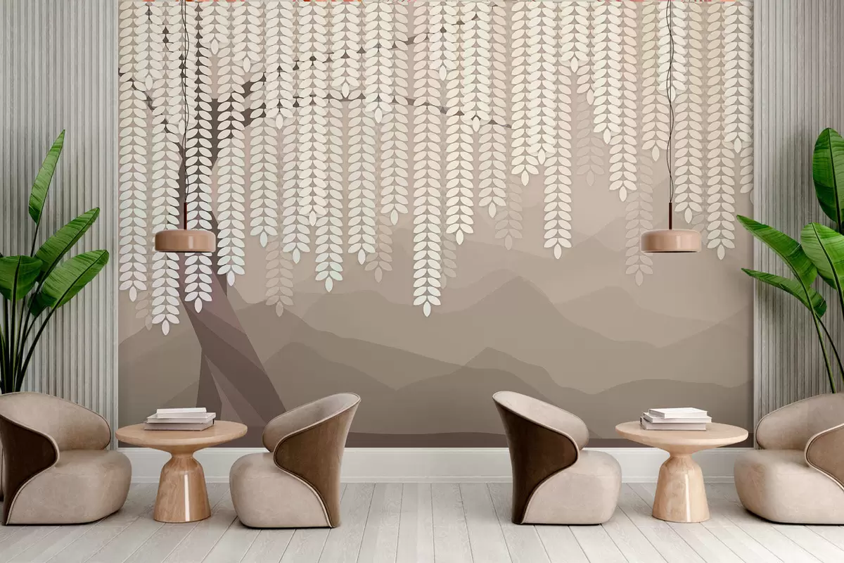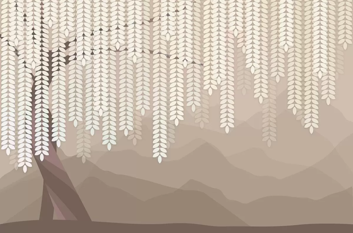 Fototapeten Stilisierter Weidenbaum mit herabhängenden Blättern vor dem Hintergrund minimalistischer Berge in Kaffeetönen Nr. w05232v2