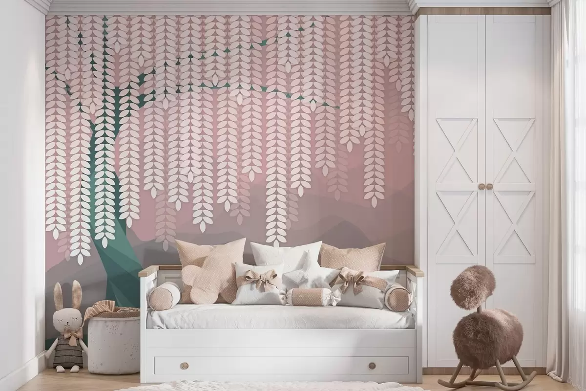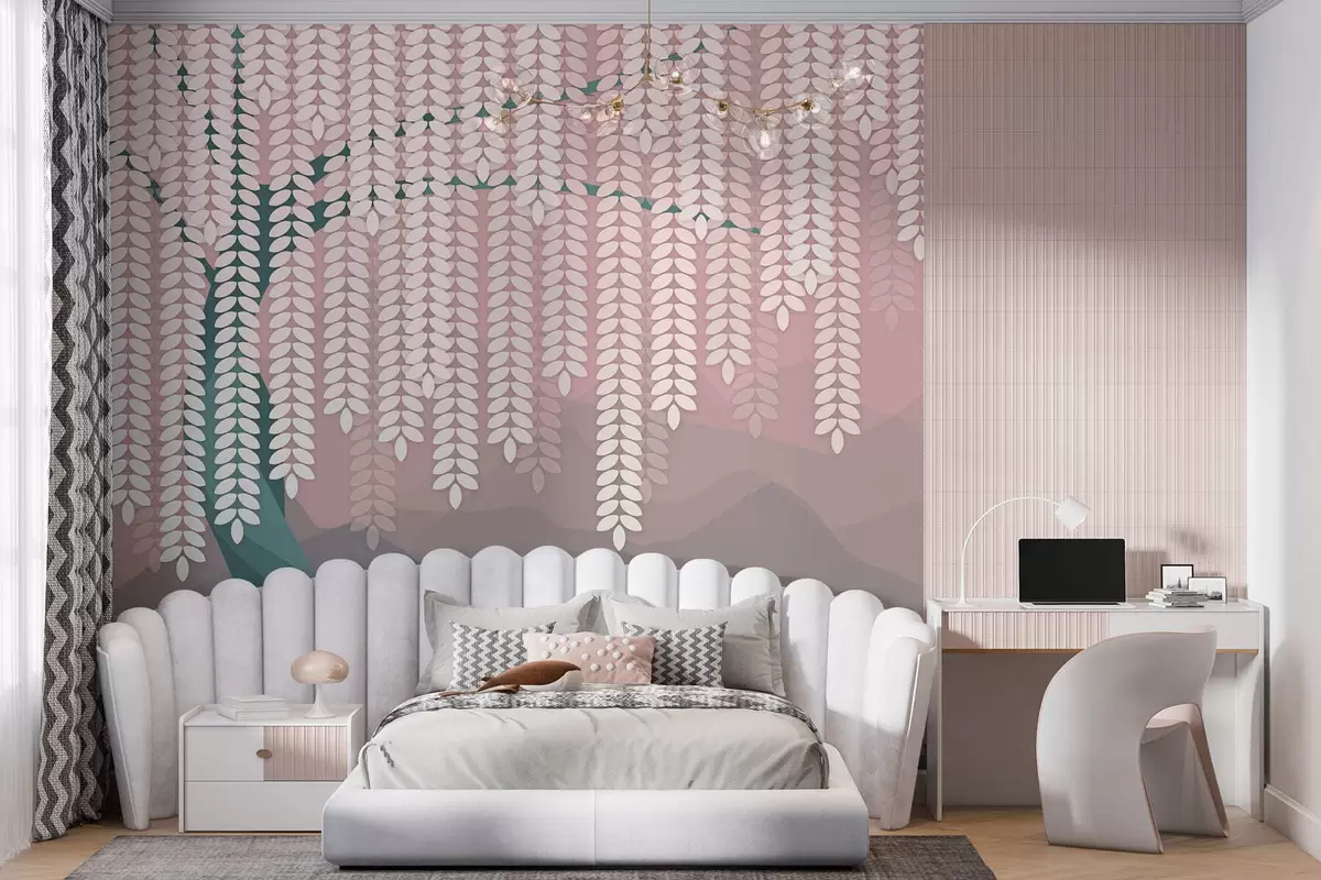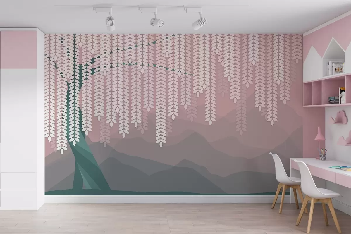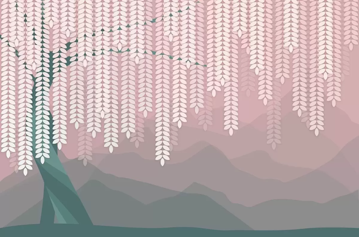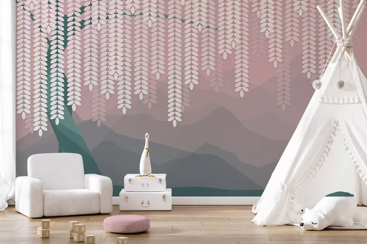 Fototapeten Stilisierter Weidenbaum mit herabhängenden Blättern vor dem Hintergrund minimalistischer Berge in Rosa- und Dunkelgrüntönen Nr. w05232v4